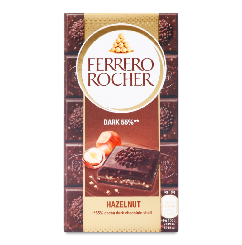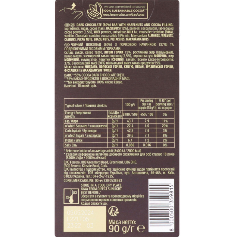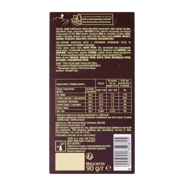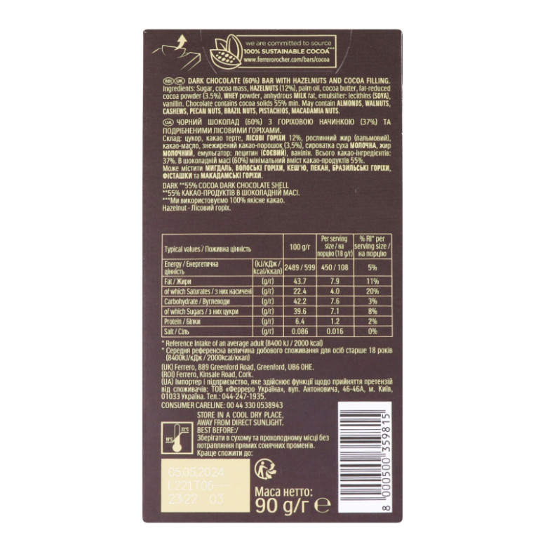 Склад (укр.): Цукор, какао терте, лісові горіхи 12%, рослинний жир (пальмовий), какао-масло, знежирений какао-порошок, сироватка суха молочна, жир молочний, емульгатор: лецитин (соєвий), ванілін