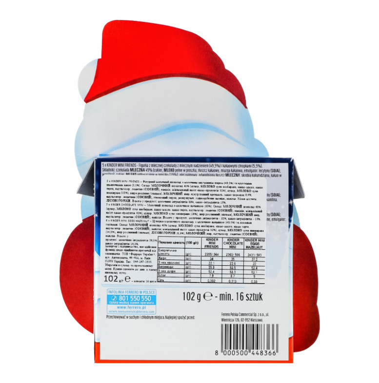 | Склад (укр.) | Mini Friends фігурний молочний шоколад з молочним внутрішнім шаром (49.5%) та хрусткими шматочками какао (5.5%): молочний шоколад 45% (цукор, молоко сухе незбиране, какао-масло, какао терте, емульгатор: лецитин (соєвий), ванілін, мінімальний вміст какао-продуктів 32%), цукор, молоко сухе знежирене (15%), жири рослинні (пальма), молочний жир, кукурудзяний крохмаль, какао-порошок 0.4%, емульгатор: лецитини (соєвий), глюкозний сироп, розпушувач: гідрокарбонат амонію, ванілін. Chocolate Mini молочний шоколад з молочною начинкою (60%): молочний шоколад 40% (цукор, молоко сухе незбиране, какао-масло, какао терте, емульгатор: лецитин (соєвий), ванілін, мінімальний вміст какао-продуктів 32%), цукор, молоко сухе знежирене (18%), жир рослинний (пальма), молочний жир, емульгатор: лецитин (соєвий), ванілін. Mini Eggs Hazelnut цукерки з молочного шоколаду з молочною начинкою (49.5%) та лісовими горіхами: молочний шоколад 45% (цукор, молоко сухе незбиране, какао-масло, какао терте, емульгатор: лецитин (соєвий), ванілін, мінімальний вміст какао-продуктів 32%), цукор, молоко сухе знежирене (14.5%), жир рослинний (пальма), лісові горіхи (6.5%), молочний жир, емульгатор: лецитин (соєвий), ванілін |