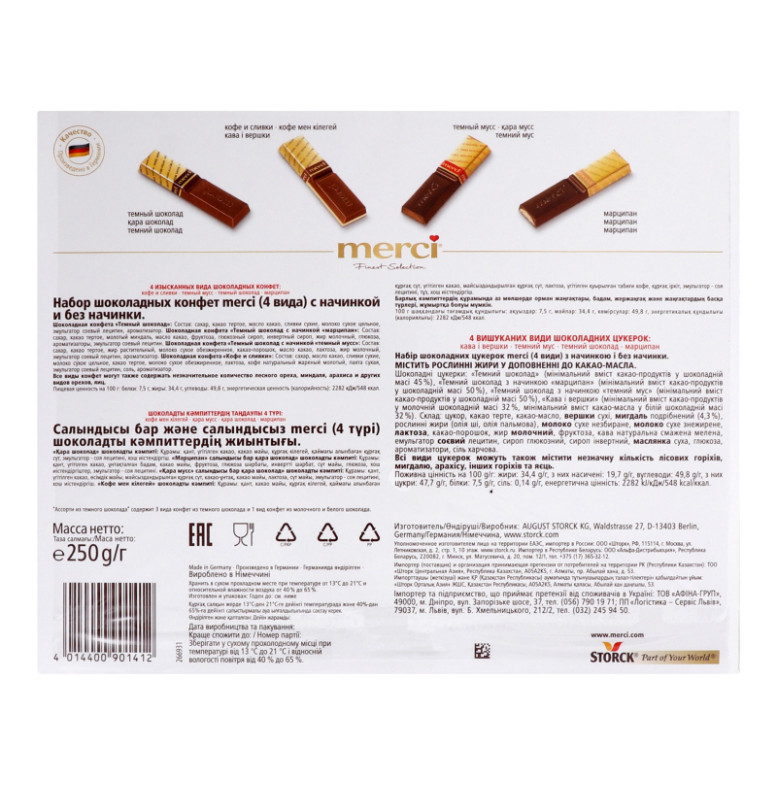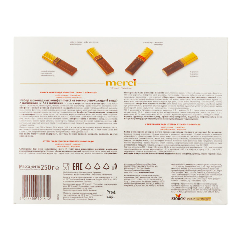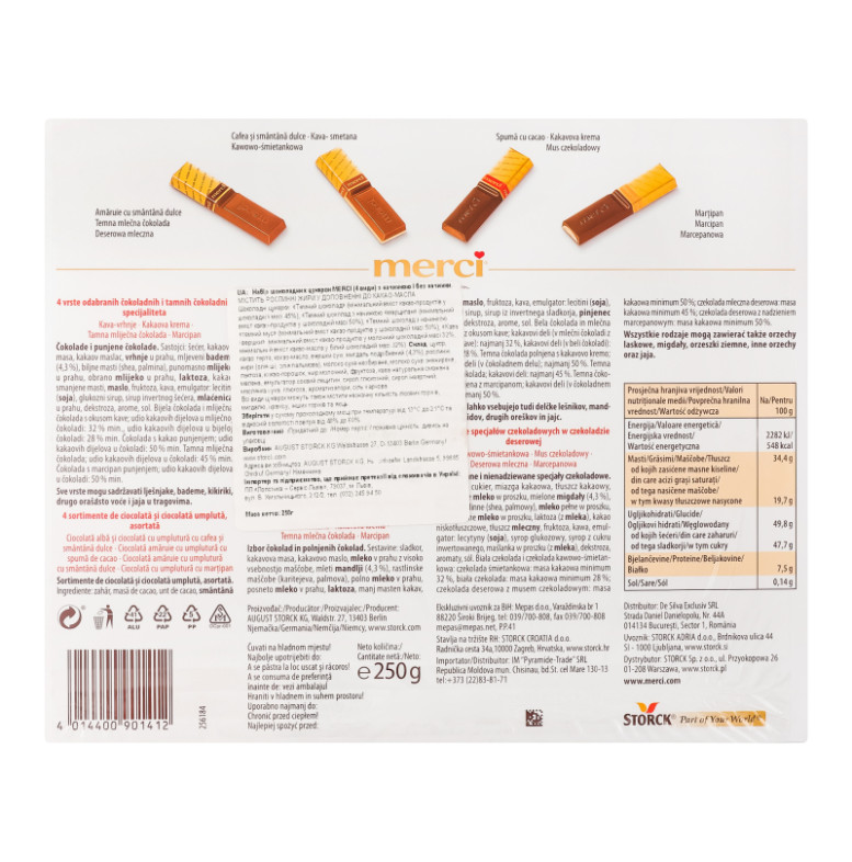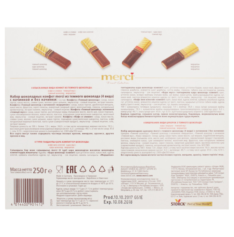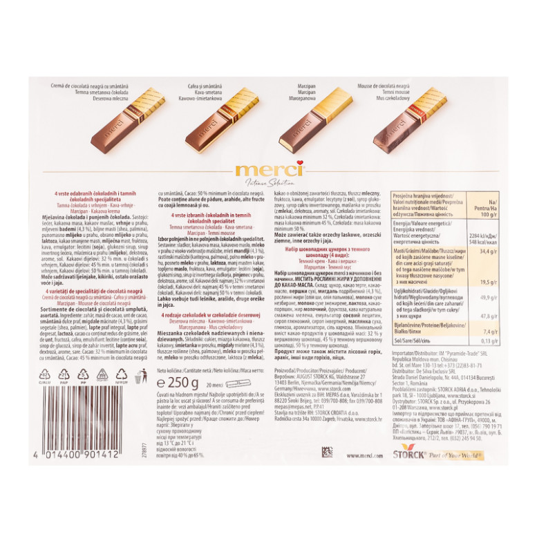 Склад: Цукор, какао терте, какао-масло, сухі вершки, мигдаль мелений, рослинний жир (пальмовий, дерева ши), незбиране сухе молоко, сироватковий продукт підсирний, лактоза, знежирене какао, сухе знежирене молоко, молочний жир, фруктоза, кава натуральна смажена мелена, емульгатор: соєвий лецитин, сироп глюкози, інвертний цукровий сироп, суха пахта, декстроза, натуральний ароматизатор (екстракт ванілі), сіль кухонна