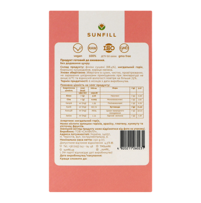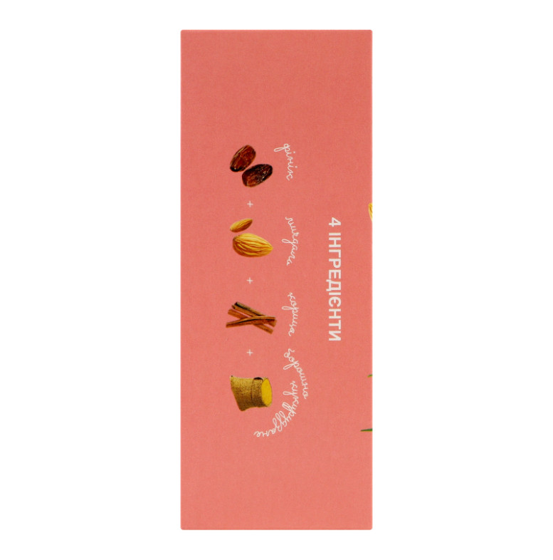 Склад (укр.)Фінік (88.4%), мигдальний горіх, борошно кукурудзяне, кориця мелена