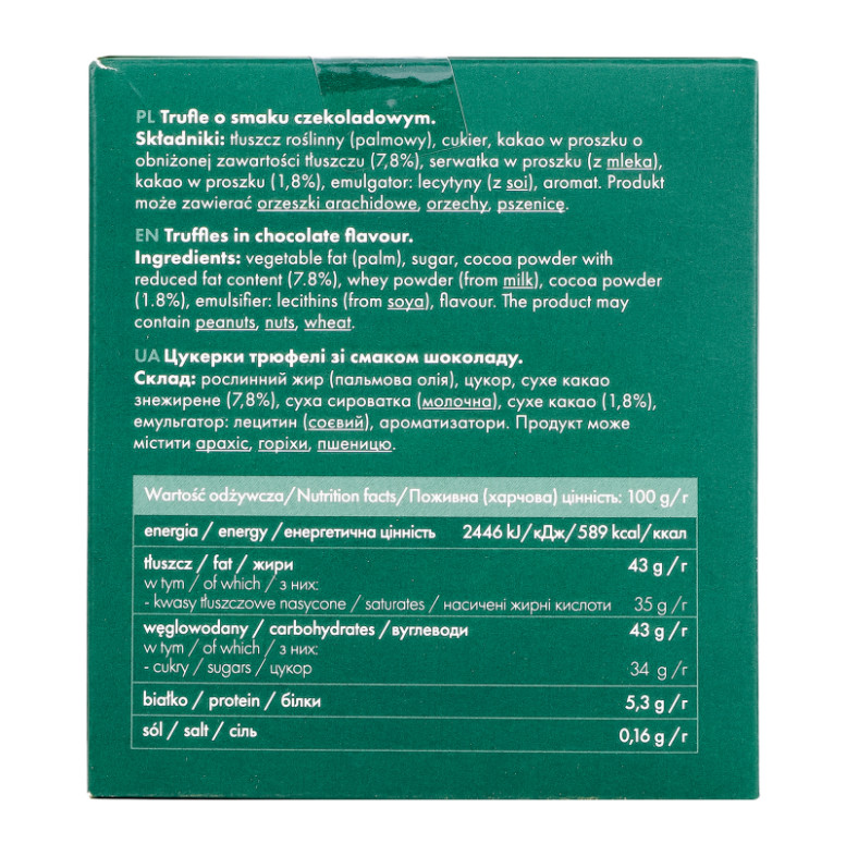 Склад (укр.)Рослинний жир (пальмова олія), цукор, сухе какао знежирене (7.8%), суха сироватка (молочна), сухе какао (1.8%), емульгатор: лецитин (соєвий), ароматизатор