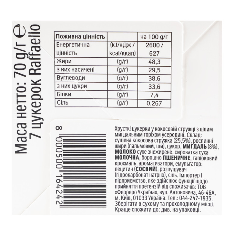 Цукерки хрусткі у кокосовій стружці з цілим мигдальним горіхом Raffaello к/у 70г