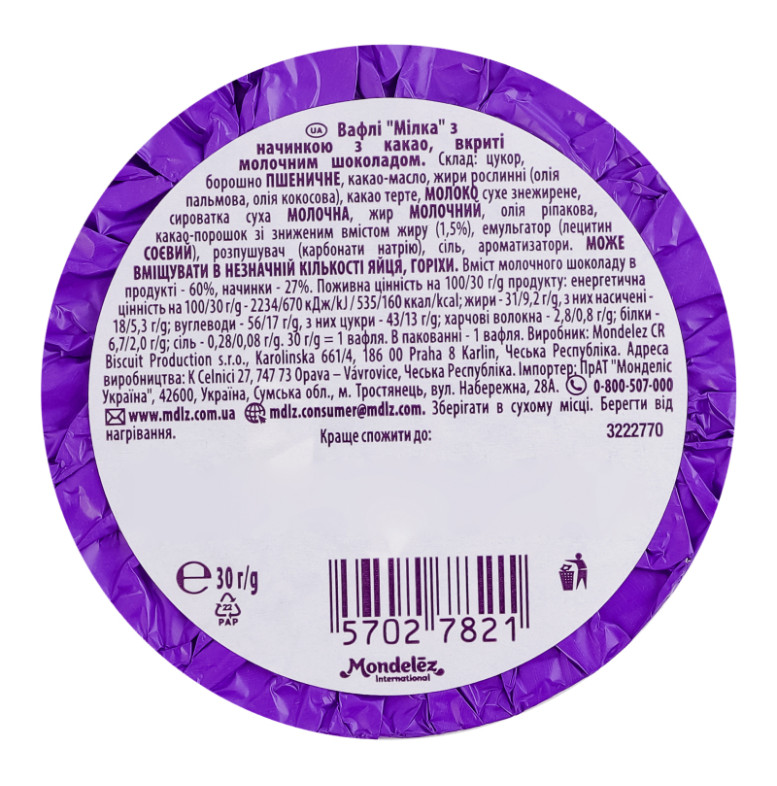 Склад: Цукор, борошно пшеничне, какао-масло, жири рослинні (олія пальмова, олія кокосова), какао терте, молоко сухе знежирене, сироватка суха молочна, жир молочний, олія ріпакова, какао-порошок зі зниженим вмістом жиру (1.5%), емульгатор (лецитин соєвий), розпушувач (карбонати натрію), сіль, ароматизатори