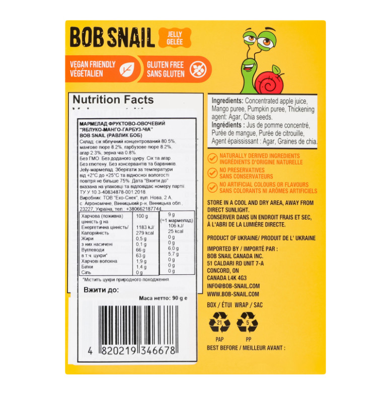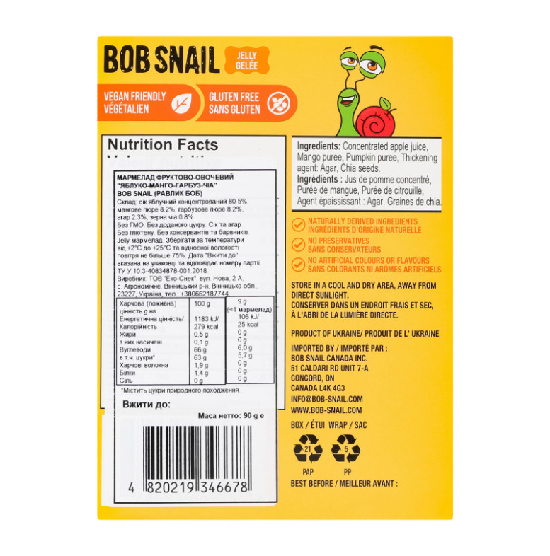 Мармелад фруктово-овочевий Яблуко-манго-гарбуз-чіа Jelly Bob Snail к/у 10х9г