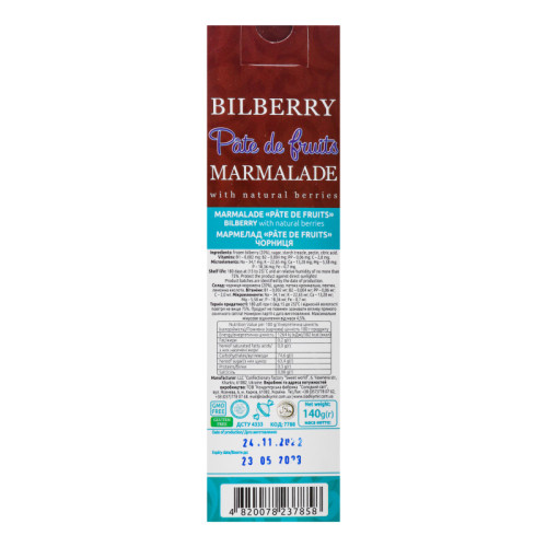 Склад (укр.): Чорниця морожена (20%), цукор, патока крохмальна, пектин, лимонна кислота