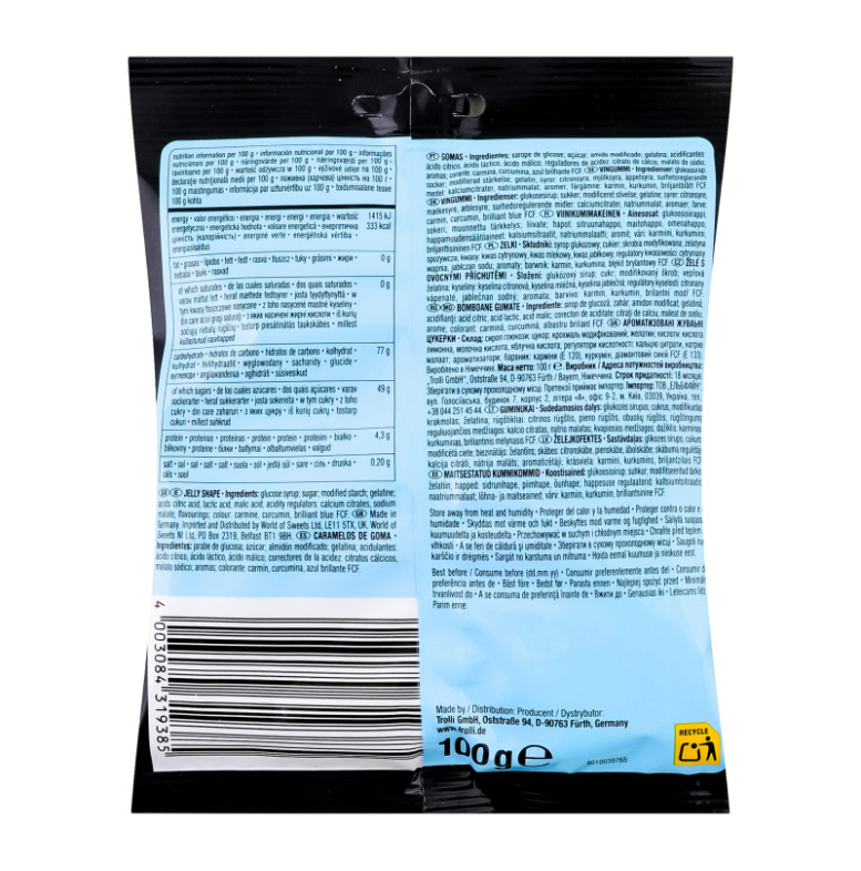 | Склад (укр.) | Сироп глюкози, цукор, крохмаль модифікований, желатин, кислоти: кислота лимонна, молочна кислота, яблучна кислота, регулятори кислотності: кальцію цитрати, натрію малаат, ароматизатори, барвник: карміни (Е120), куркумін, діамантовий синій FCF (Е133) |