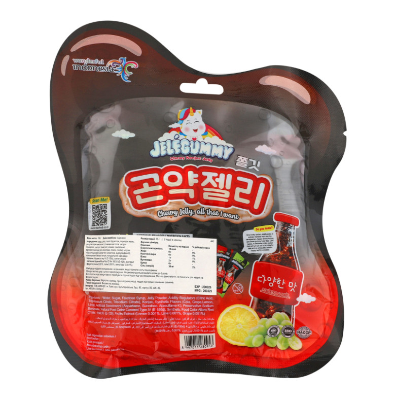 Склад: Вода, цукор, сироп фруктози, порошок желе, регулятори кислотності (лимонна кислота, цитрат трикалію, цитрат тринатрію), конжак, синтетичні ароматизатори (кола, виноград, лимон, лайм), штучні підсолоджувачі (аспартам, сукралоза, ацесульфам-К), консервант бензоат натрію, натуральний харчовий барвник карамель типу IV (E150d), синтетичний харчовий барвник Allur Red CI №16035 (Е129), екстракт фруктів (лимон 0.001%, лайм 0.001%, виноград 0.001%)