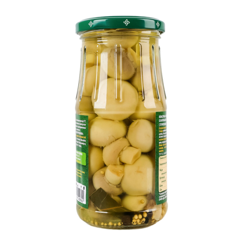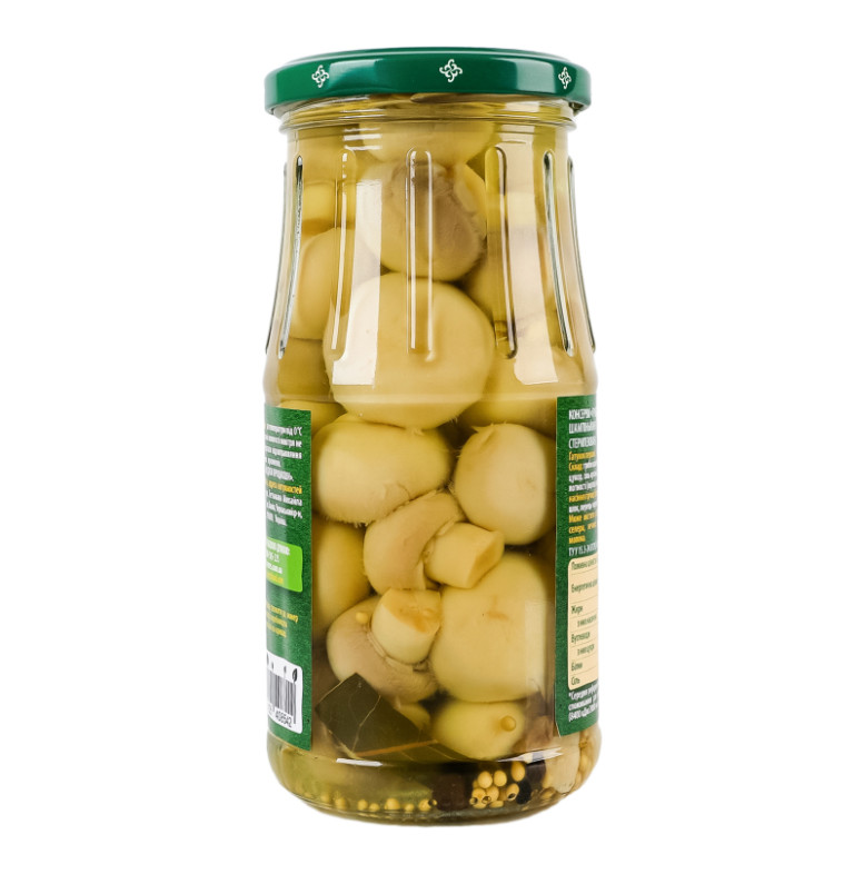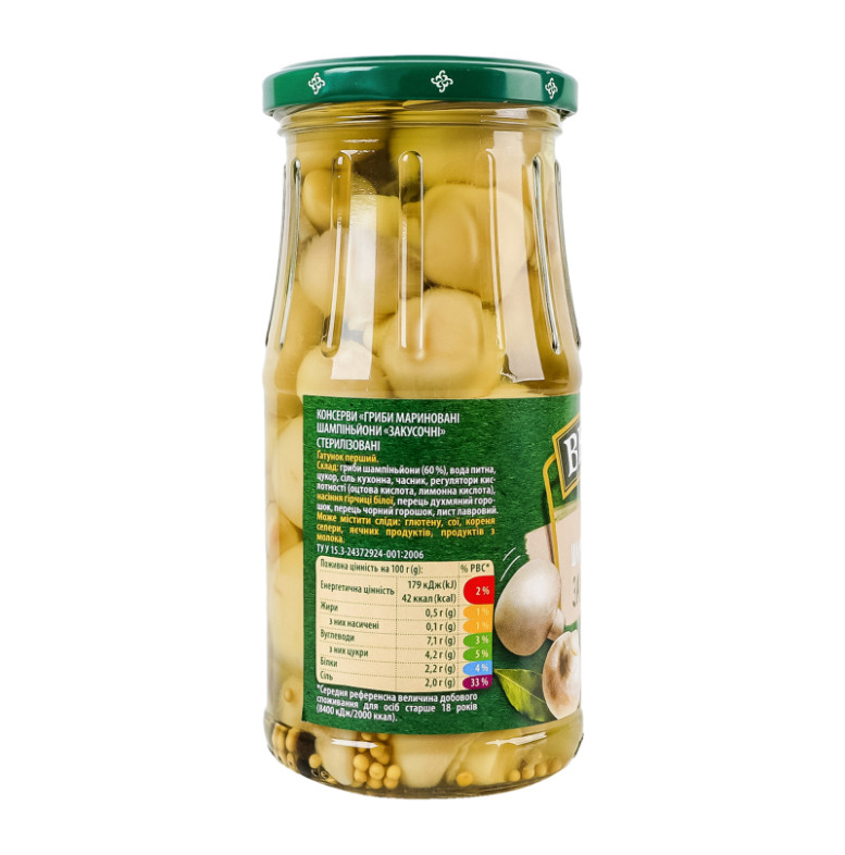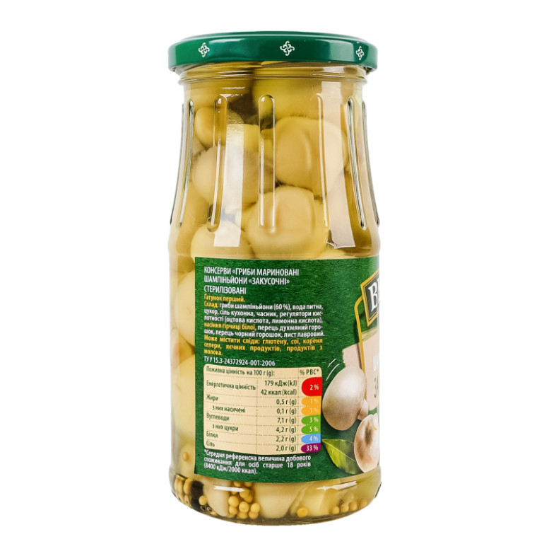 | Склад (укр.) | Гриби шампіньйони (60%), вода питна, цукор, сіль кухонна, часник, регулятори кислотності (оцтова кислота, лимонна кислота), насіння гірчиці білої, перець духмяний горошок, перець чорний горошок, лист лавровий |
