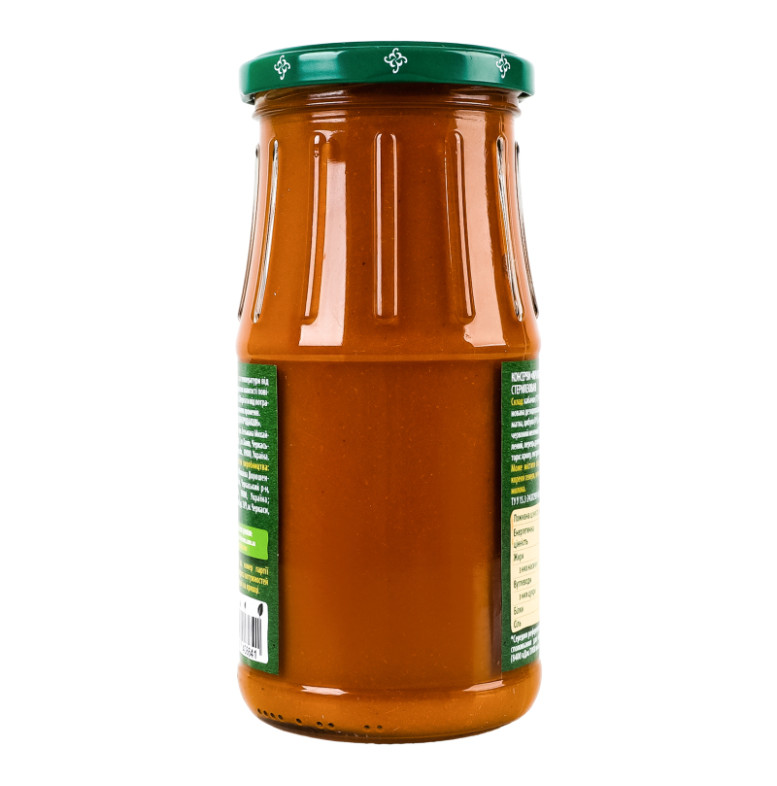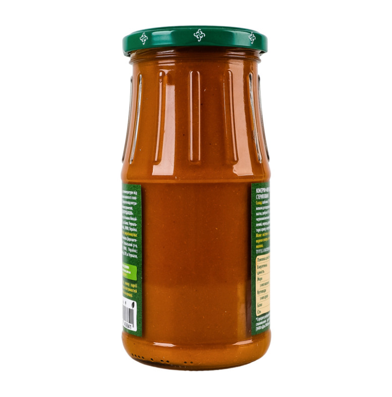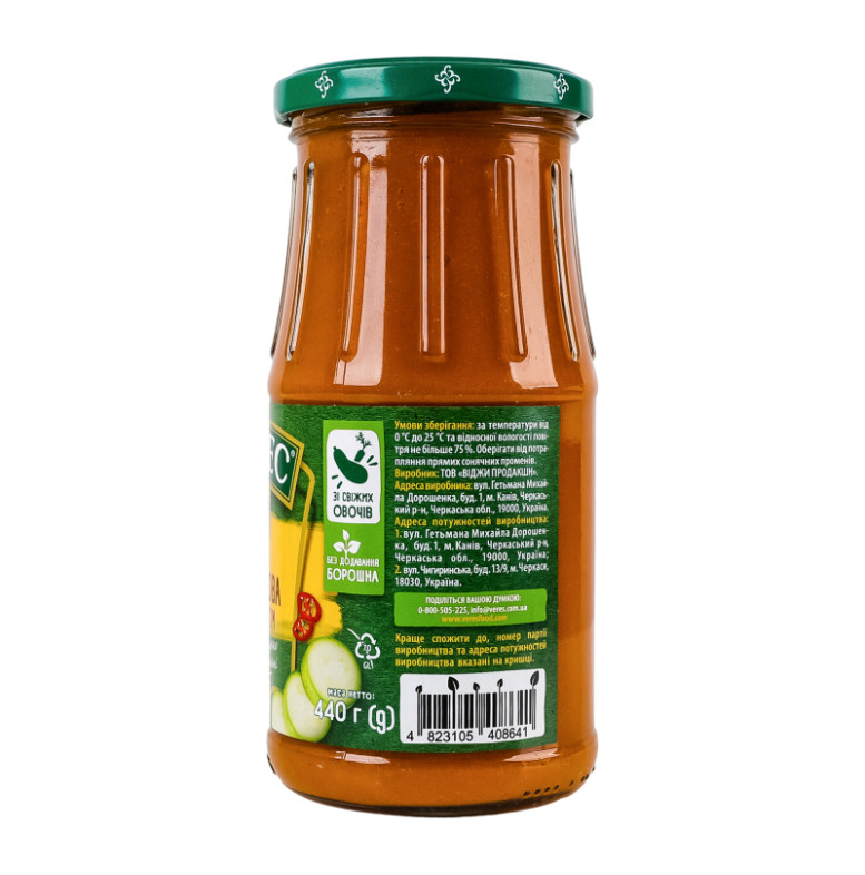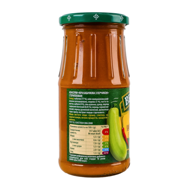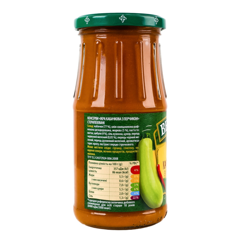 | Склад (укр.) | Кабачки (77%), олія соняшникова рафінована дезодорована, морква (5%), паста томатна, цибуля (4%), сіль кухонна, цукор, перець червоний мелений (0.05%), перець чорний мелений, перець духмяний мелений, ароматизатори: кропу, екстракт перцю стручкового |