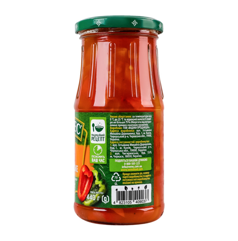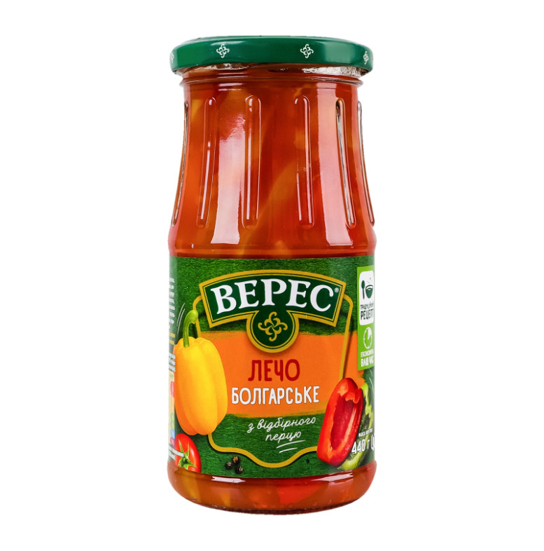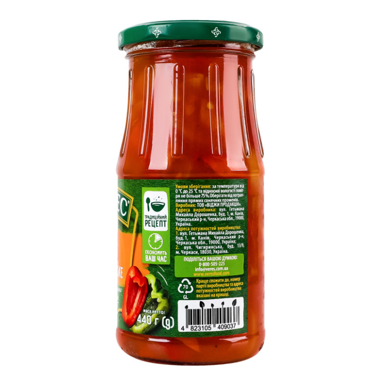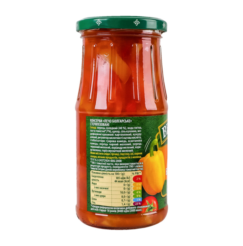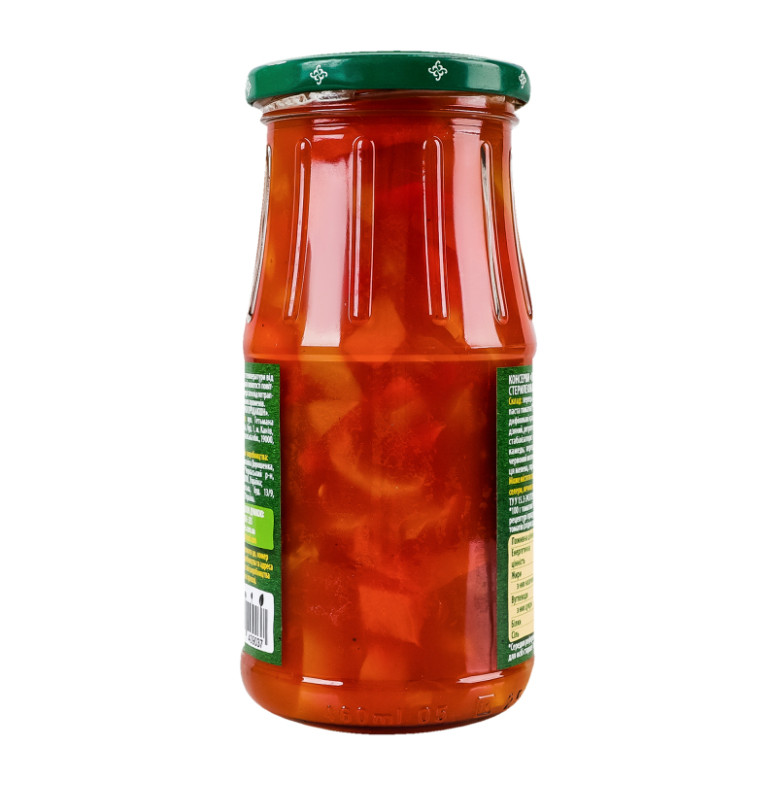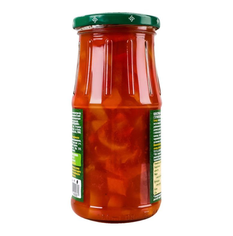 | Склад (укр.) | Перець солодкий (40%), вода питна, паста томатна (7%), цукор, сіль кухонна, модифіковані крохмалі: картопляний, кукурудзяний, регулятор кислотності оцтова кислота, стабілізатори: гуарова камедь, ксантанова камедь, перець чорний мелений, перець червоний мелений, коріандр мелений, кориця мелена, горіх мускатний мелений |