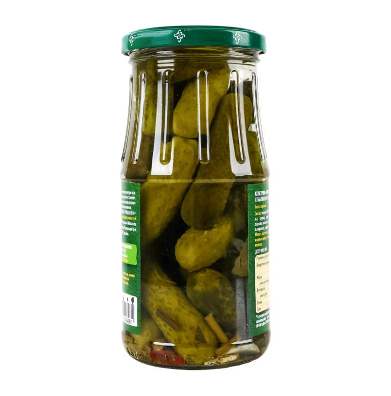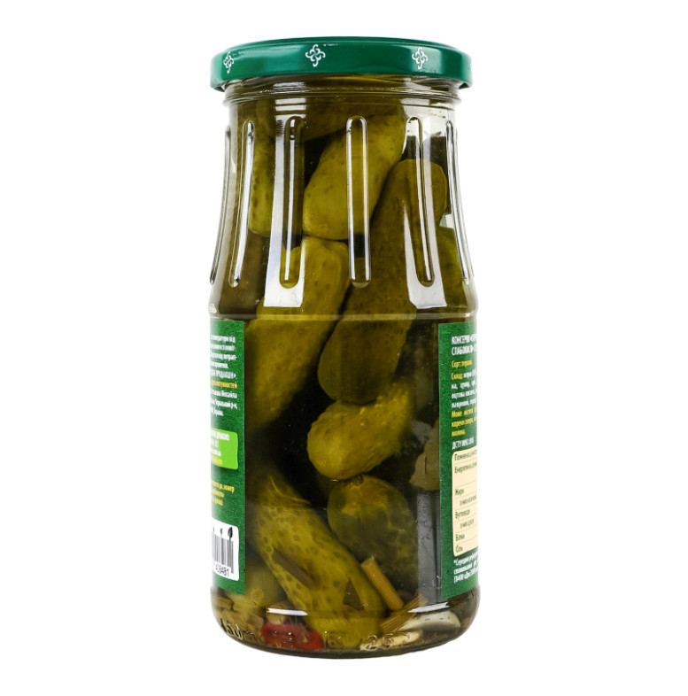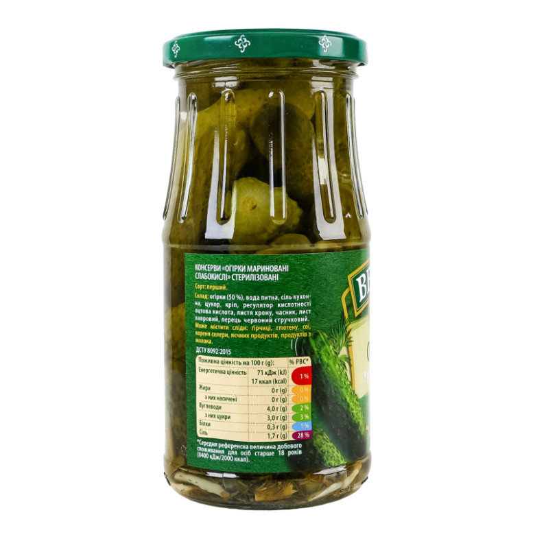 | Склад (укр.) | Огірки (50%), вода питна, сіль кухонна, цукор, кріп, регулятор кислотності оцтова кислота, листя хрону, часник, лист лавровий, перець червоний стручковий |