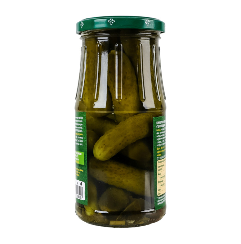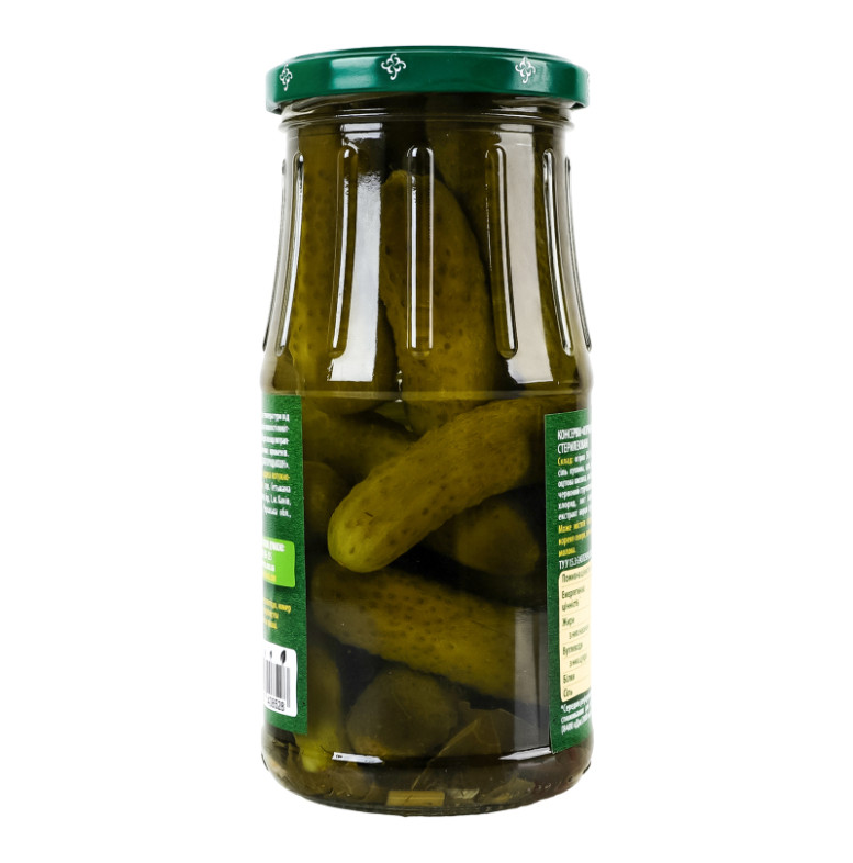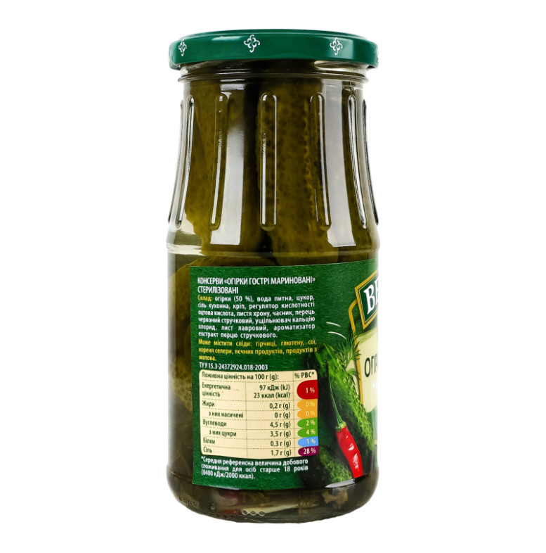 | Склад (укр.) | Огірки (50%), вода питна, цукор, сіль кухонна, кріп, регулятор кислотності оцтова кислота, листя хрону, часник, перець червоний стручковий, ущільнювач кальцію хлорид, лист лавровий, ароматизатор екстракт перцю стручкового |