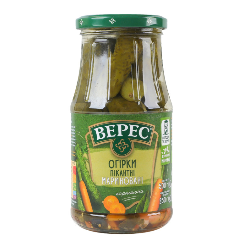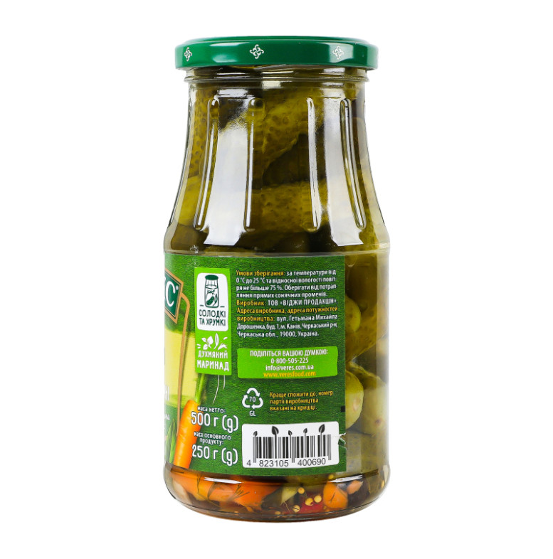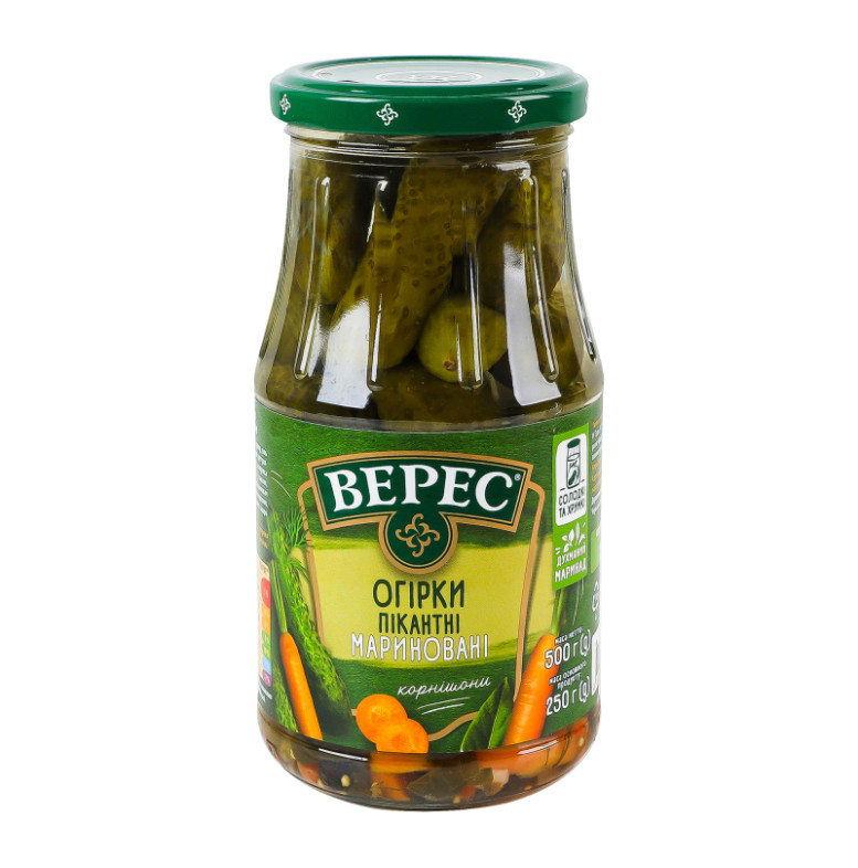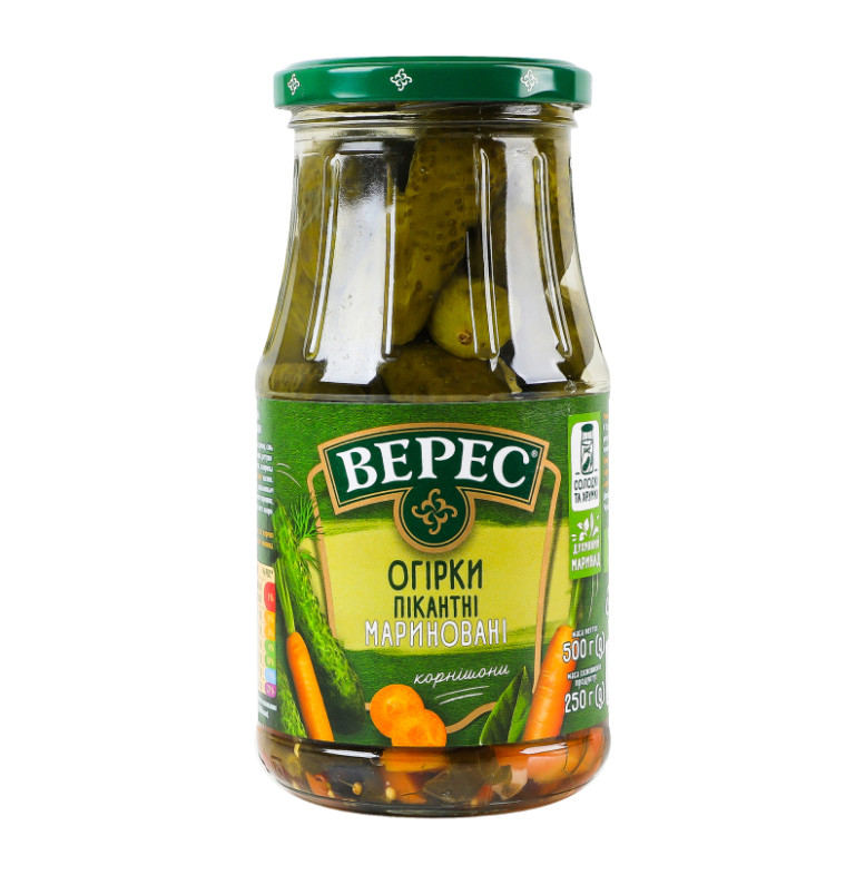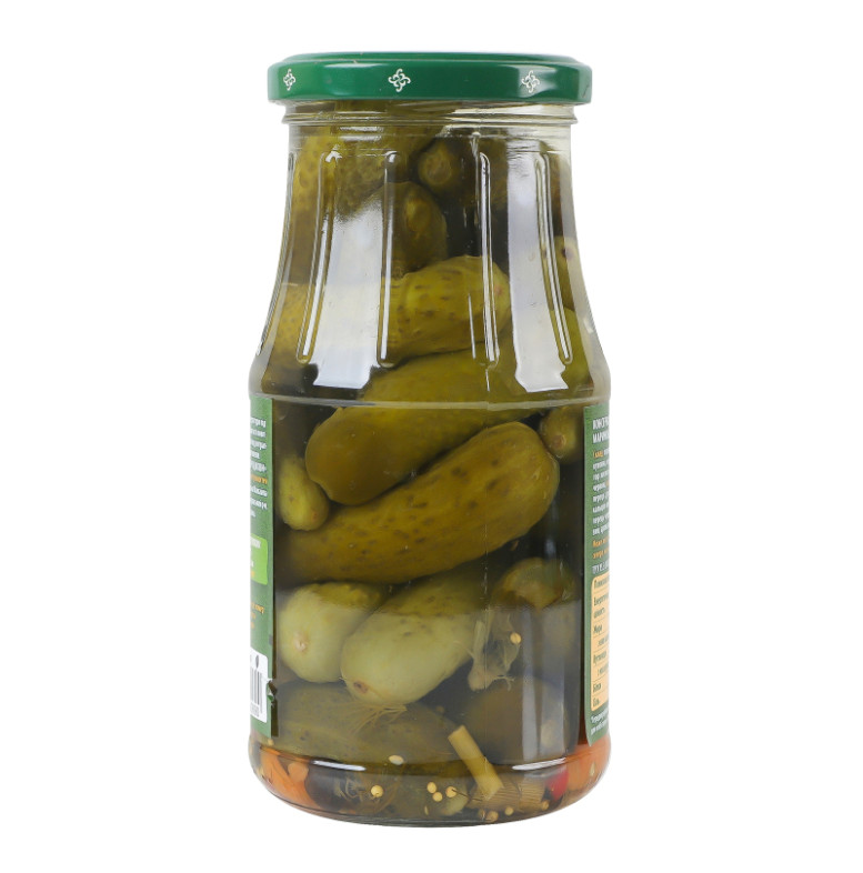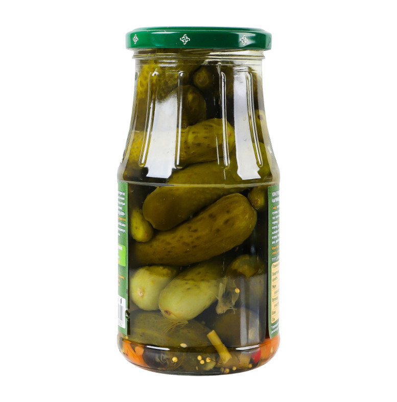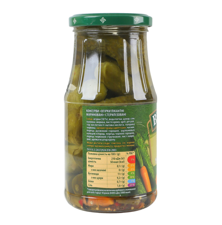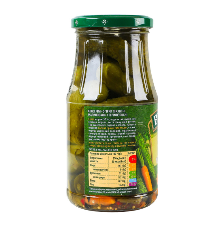Склад: Огірки (50%), вода питна, цукор, сіль кухонна, морква, листя хрону, кріп, регулятор кислотності оцтова кислота, паприка червона, насіння гірчиці сарептської, часник, перець духмяний горошок, ущільнювач кальцію хлорид, перець чорний горошок, перець червоний стручковий, лист лавровий, ароматизатор кропу