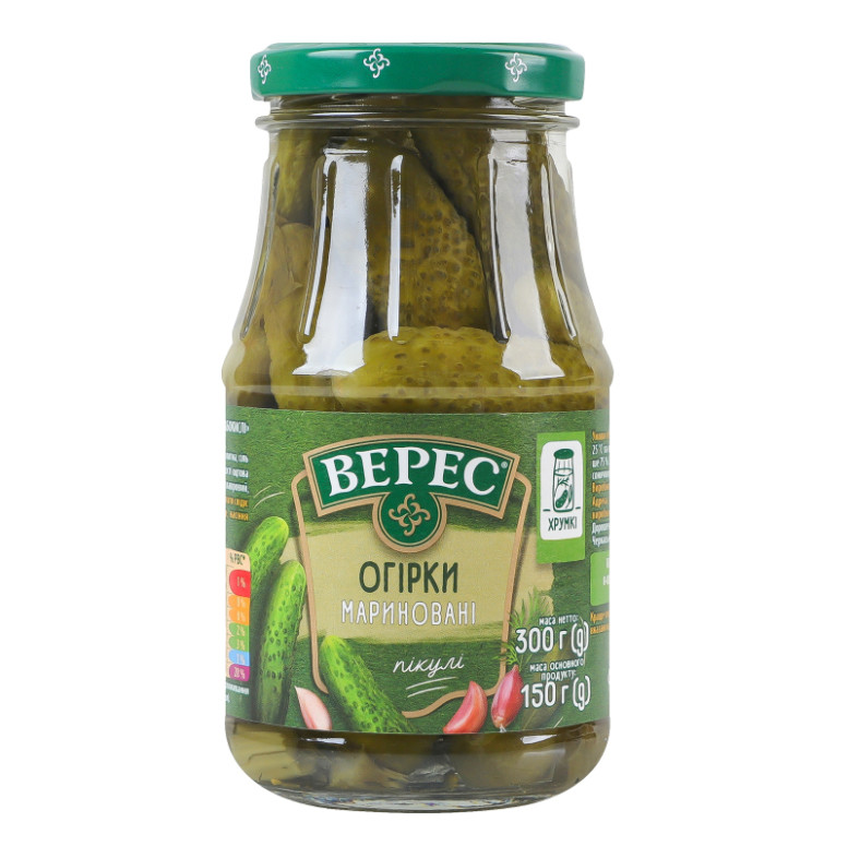 | Склад (укр.) | Огірки (50%), вода питна, сіль кухонна, цукор, кріп, регулятор кислотності оцтова кислота, листя хрону, часник, лист лавровий, перець червоний стручковий |