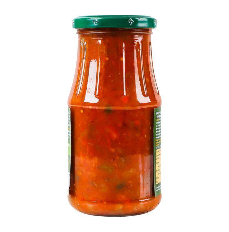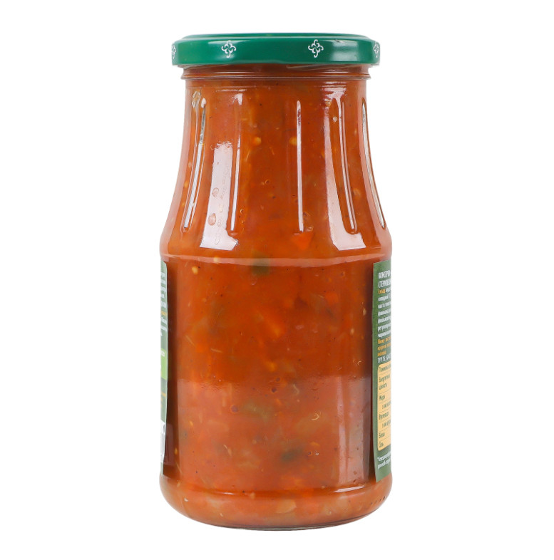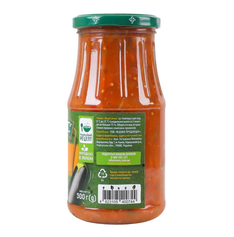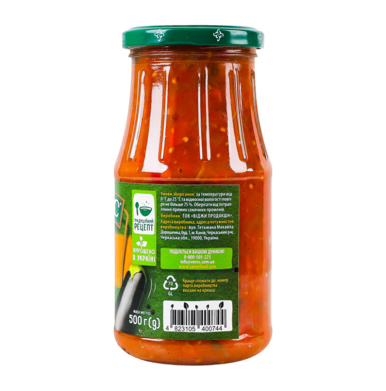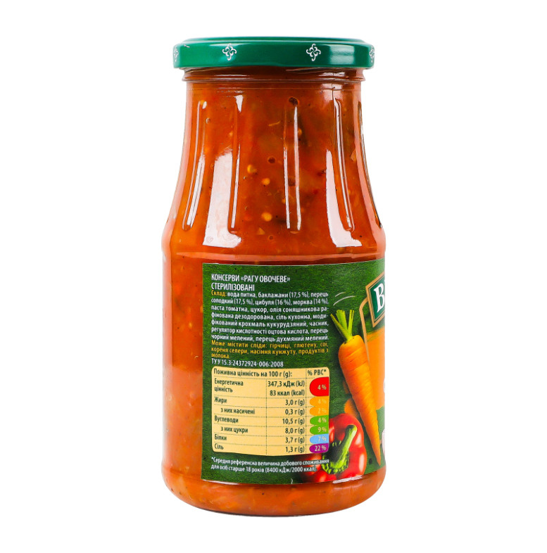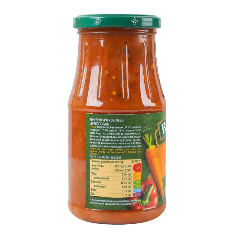 Склад: Вода питна, баклажани (17.5%), перець солодкий (17.5%), цибуля (16%), морква (14%), паста томатна, цукор, олія соняшникова рафінована дезодорована, сіль кухонна, модифікований крохмаль кукурудзяний, часник, регулятор кислотності кислота оцтова, перець чорний мелений, перець духмяний мелений
