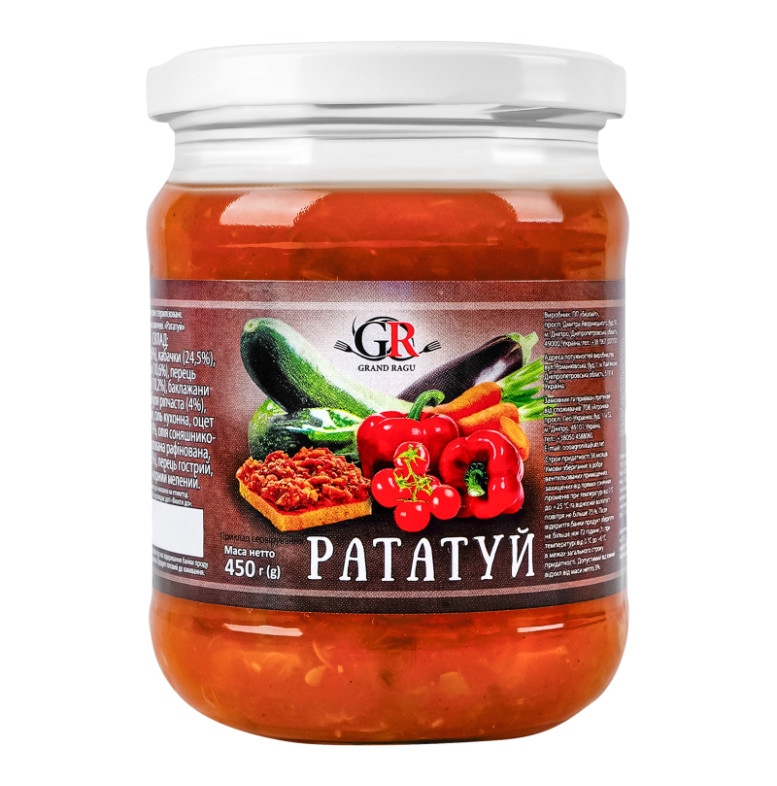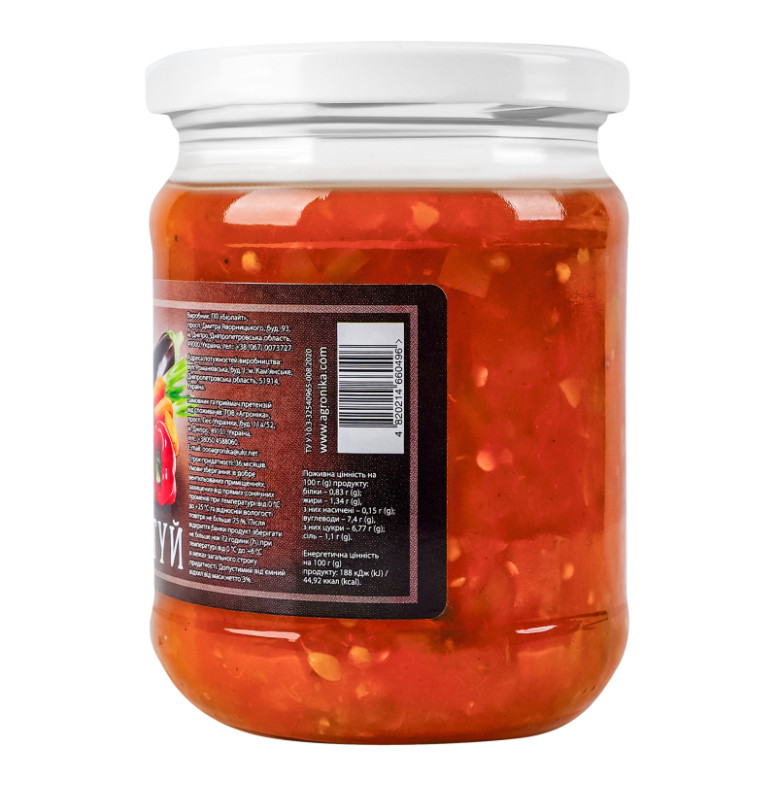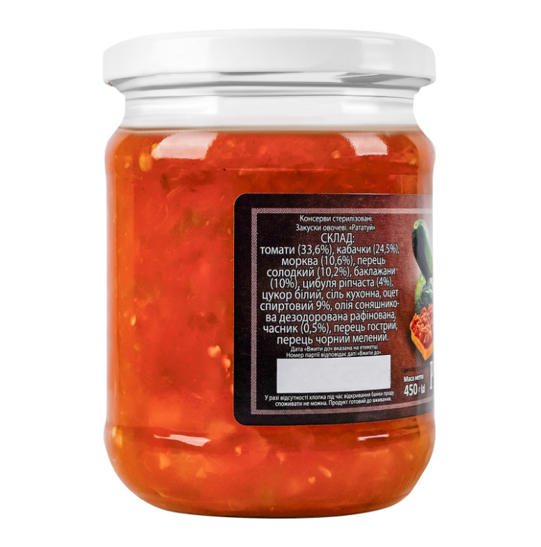 Склад (укр.)Томати (33.6%), кабачки (24.5%), морква (10.6%), перець солодкий (10.2%), баклажани (10%), цибуля ріпчаста (4%), цукор білий, сіль кухонна, оцет спиртовий 9%, олія соняшникова дезодорована рафінована, часник (0.5%), перець гострий, перець чорний мелений