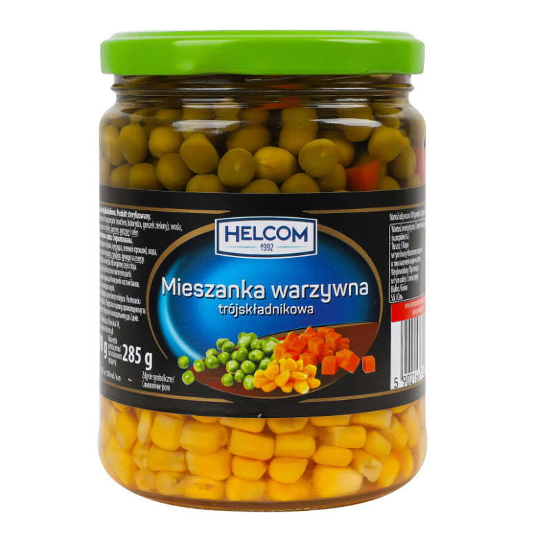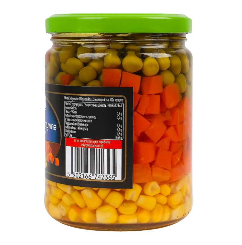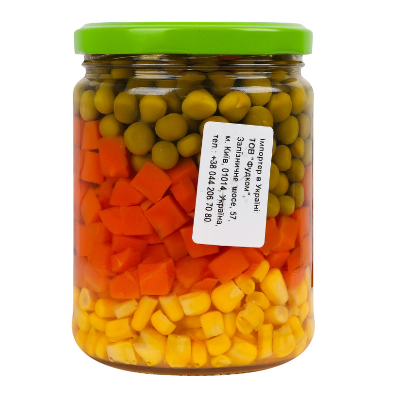 | Склад (укр.) | Овочі в різних пропорціях (морква, кукурудза, зелений горошок), вода, сіль, цукор |