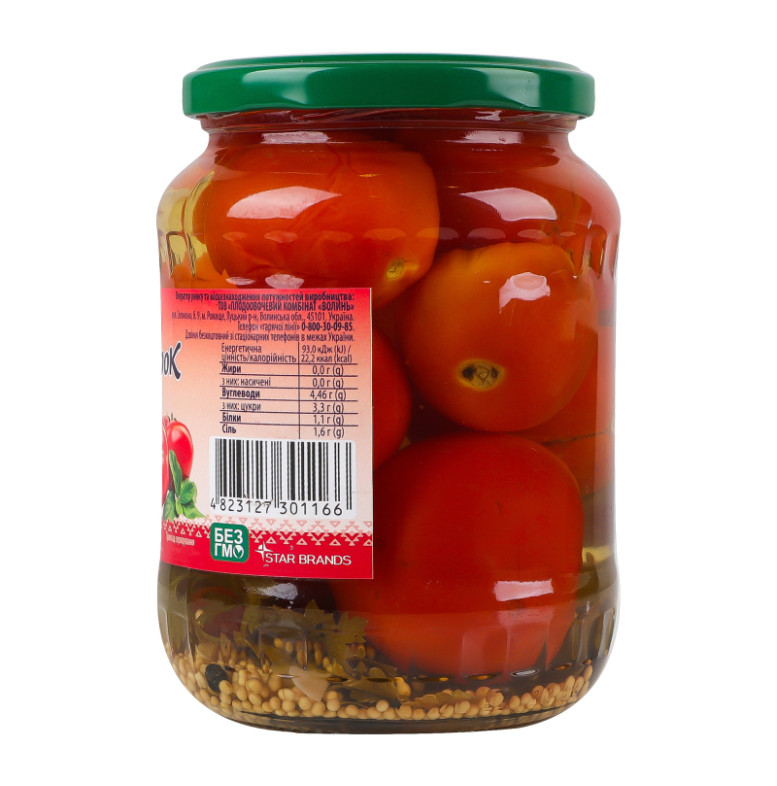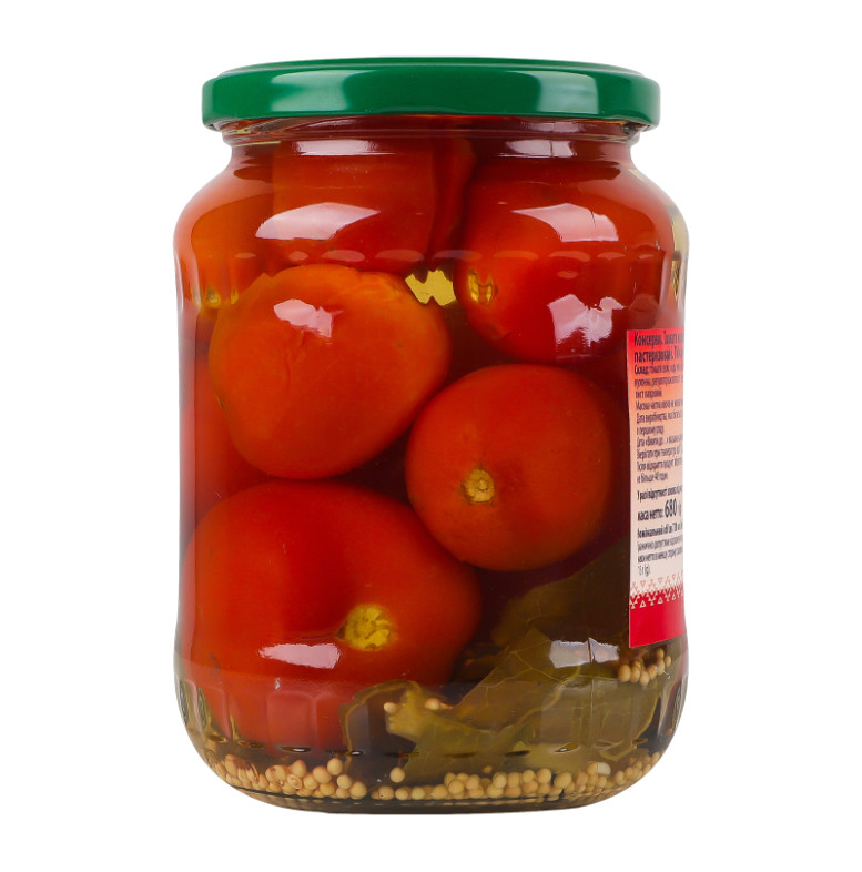 | Склад (укр.) | Томати свіжі, вода питна підготовлена, цукор білий кристалічний, сіль кухонна, регулятор кислотності - оцтова кислота, кріп свіжий, насіння гірчиці, лист лавровий |