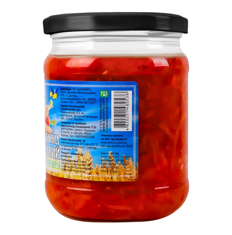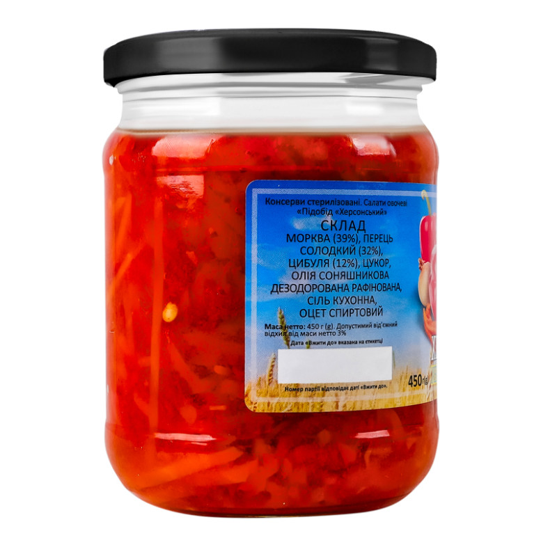 | Склад (укр.) | Морква (39%), перець солодкий (32%), цибуля (12%), цукор, олія соняшникова дезодорована рафінована, сіль кухонна, оцет спиртовий |