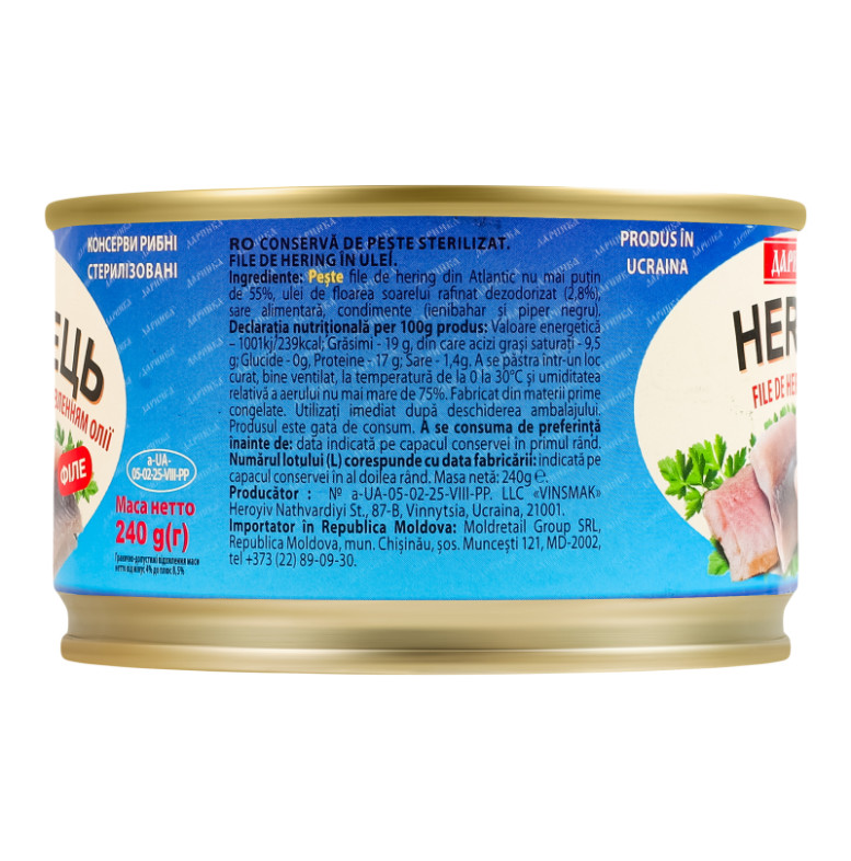 Склад: Риба філе оселедця атлантичного не менше 55%, олія соняшникова рафінована дезодорована - 2.8%, сіль кухонна, прянощі (перець духмяний чи перець чорний)