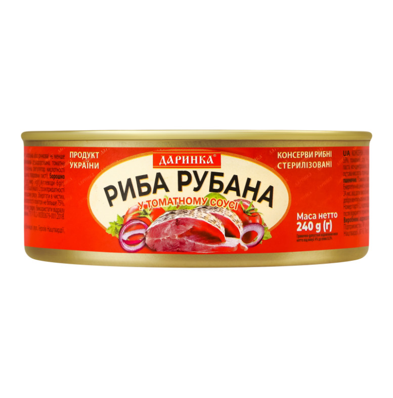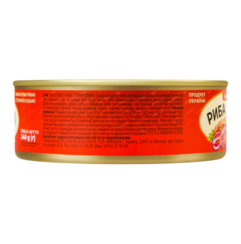 Склад: Риба розібрана (морська або річкова) не менше 55%, томатний соус не більше 45% (вода питна, олія соняшникова рафінована дезодорована, томатна паста концентрована, цукор, цибуля обжарена (олія соняшникова), сіль кухонна, регулятор кислотності оцтова кислота, прянощі (перець духмяний, перець чорний, коріандр, гвоздика, лавровий лист)), борошно пшеничне