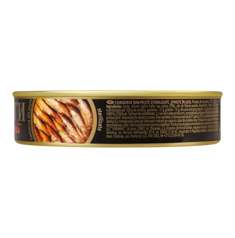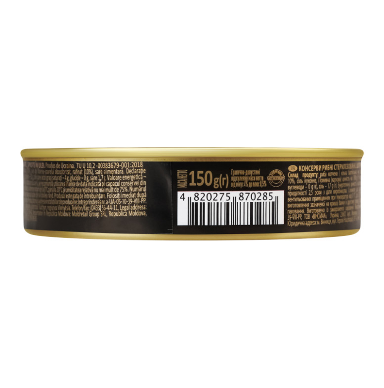 Склад: Риба копчена (кілька балтійська чи салака) не менше 70%, олія соняшникова рафінована дезодорована не менше 10%, сіль кухонна