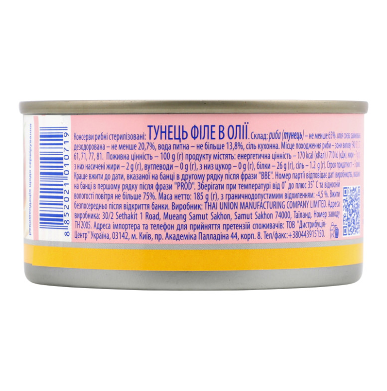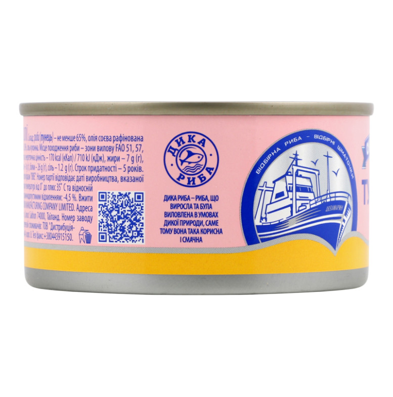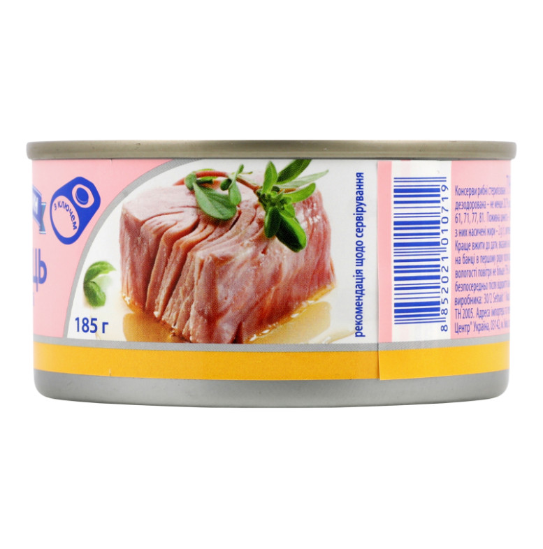 | Склад (укр.) | Риба (тунець) - не менше 65%, олія соєва рафінована дезодорована - не менше 20.7%, вода питна - не більше 13.8%, сіль кухонна |