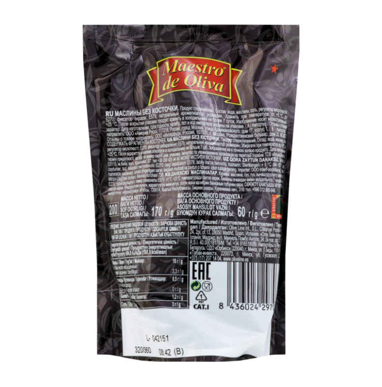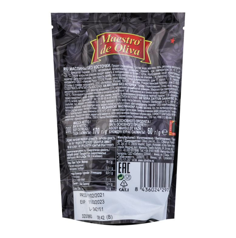 | Склад (укр.) | Вода, маслини без кісточки, сіль, регулятор кислотності: E270, барвник: E579, натуральний ароматизатор: розмарин |