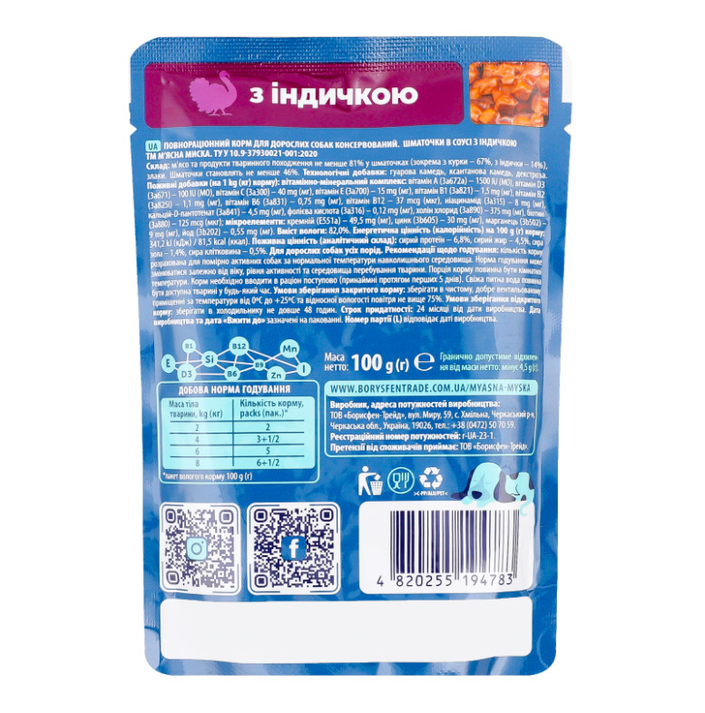 | Склад (укр.) | М'ясо та продукти тваринного походження не менше 81% у шматочках (зокрема з курки - 67%, з індички - 14%), злаки |