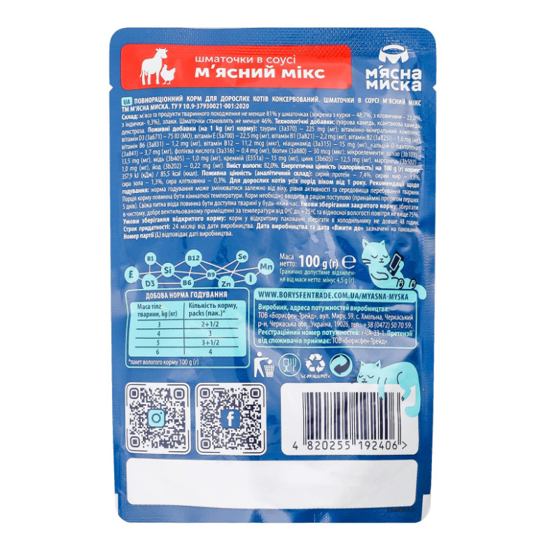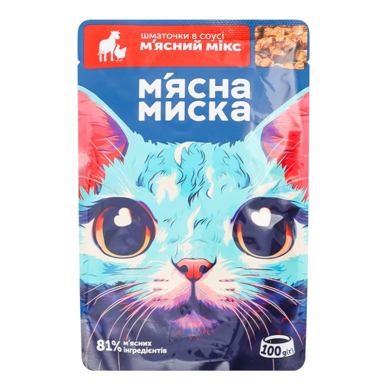 Корм консервований повнораціонний для дорослих котів шматочки в соусі М'ясний мікс М'ясна Миска д/п 100г