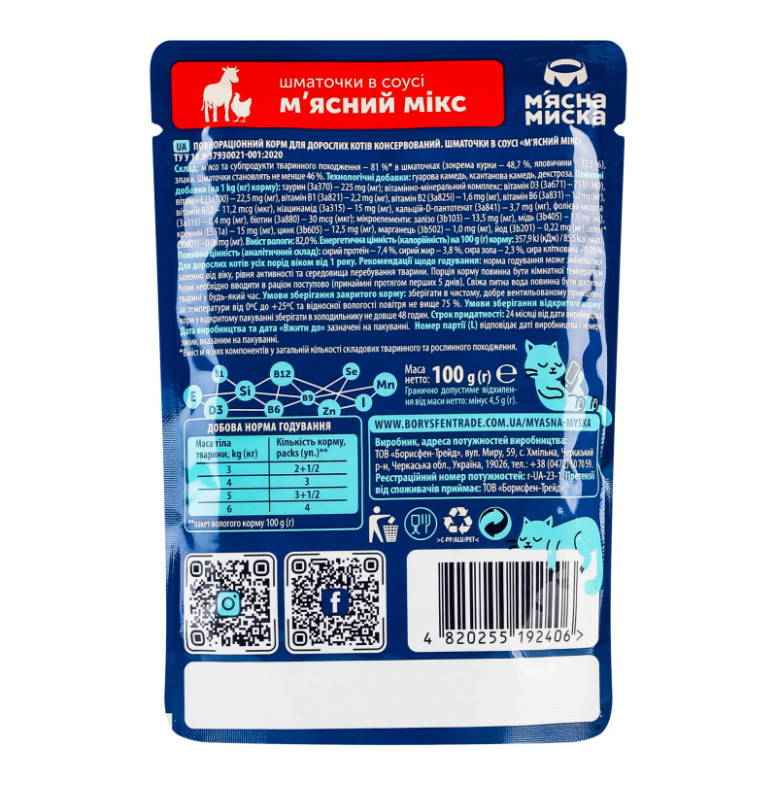 Корм консервований повнораціонний для дорослих котів М'ясний мікс Шматочки в соусі М'ясна Миска д/п 100г