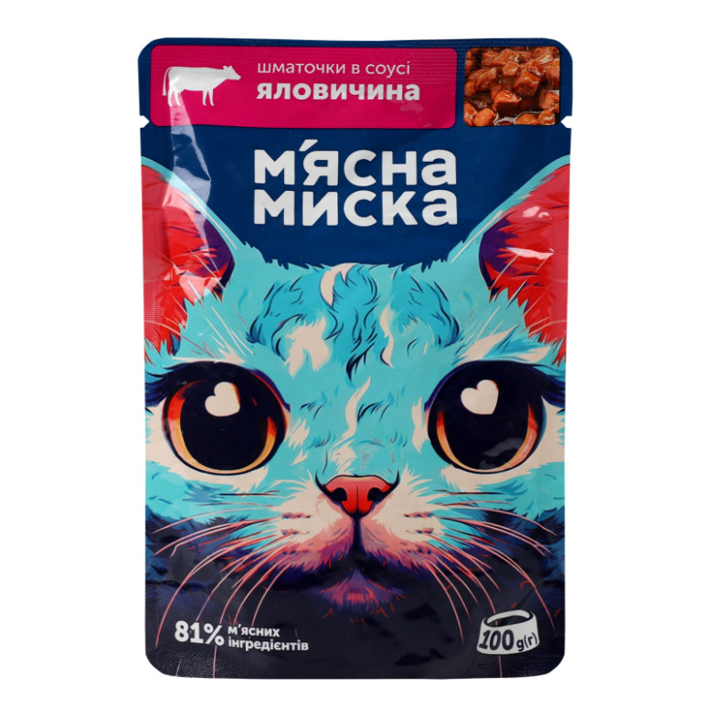 Корм консервований повнораціонний для дорослих котів Яловичина Шматочки в соусі М'ясна Миска д/п 100г