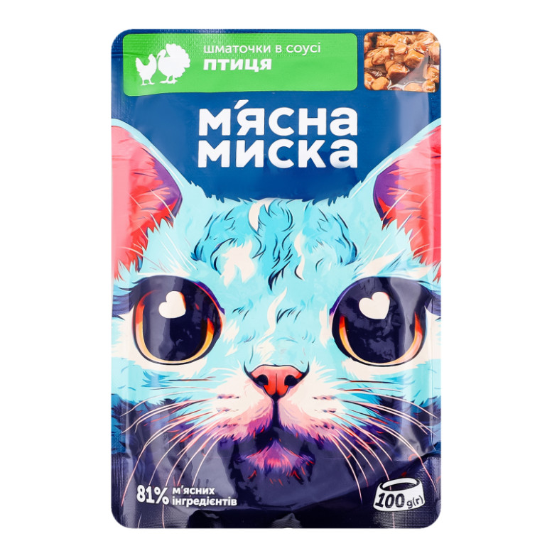 Корм консервований повнораціонний для дорослих котів Шматочки в соусі з птицею М'ясна Миска д/п 100г
