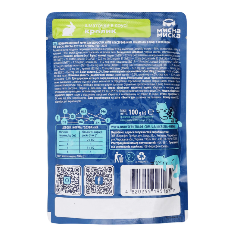 Корм консервований повнораціонний для дорослих котів Шматочки в соусі з кроликом М'ясна Миска д/п 100г