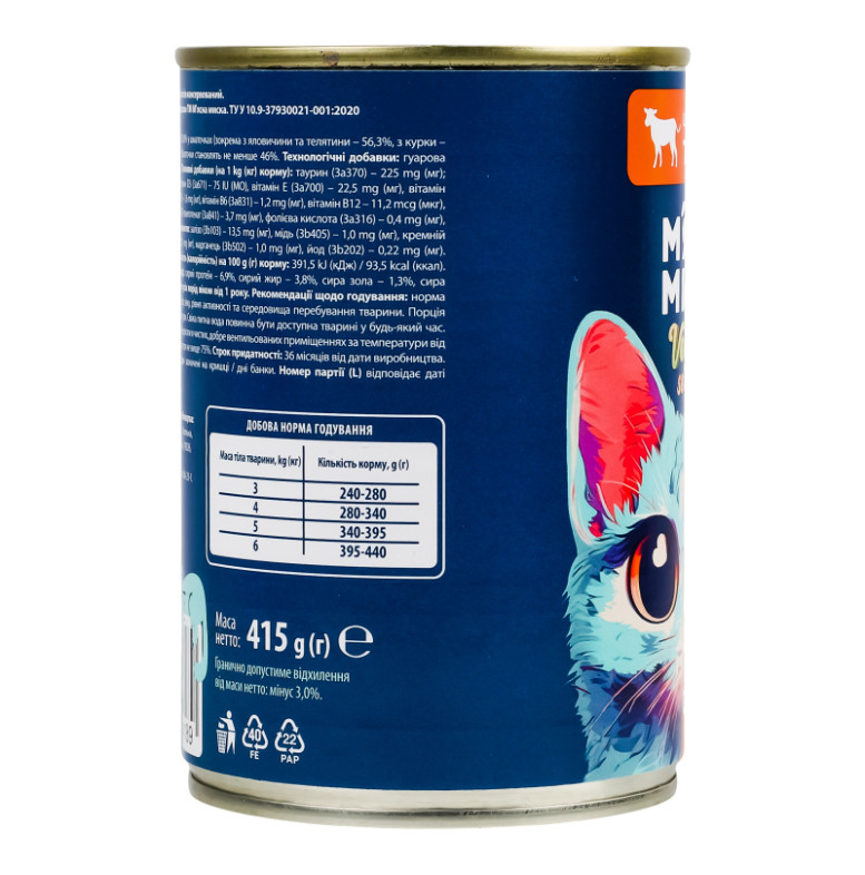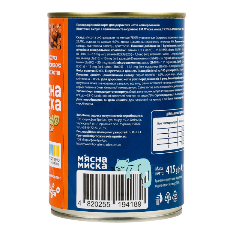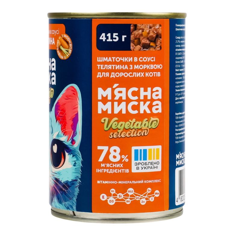 | Склад (укр.) | М'ясо та субпродукти не менше 78% у шматочках (зокрема з яловичини та телятини - 56.3%, з курки - 21.7%), моркви не менше 4%, злаки |