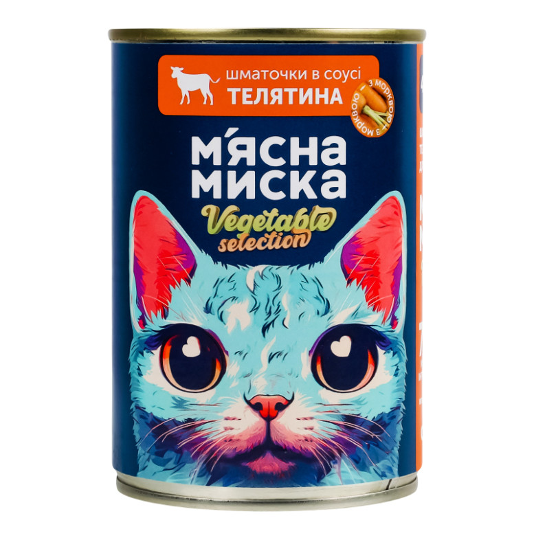 Корм консервований повнораціонний для дорослих котів Шматочки в соусі з телятиною та морквою М'ясна Миска з/б 415г