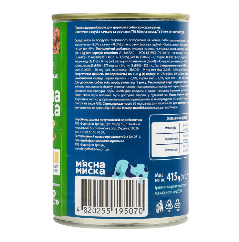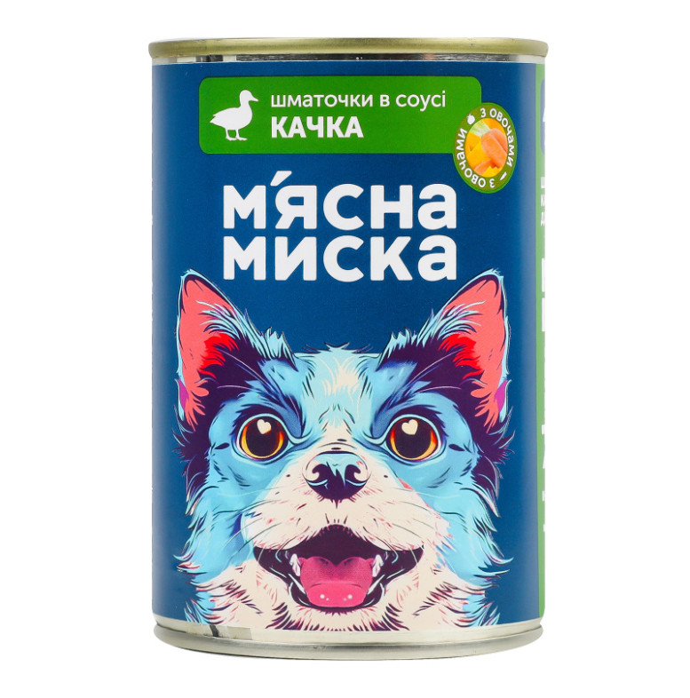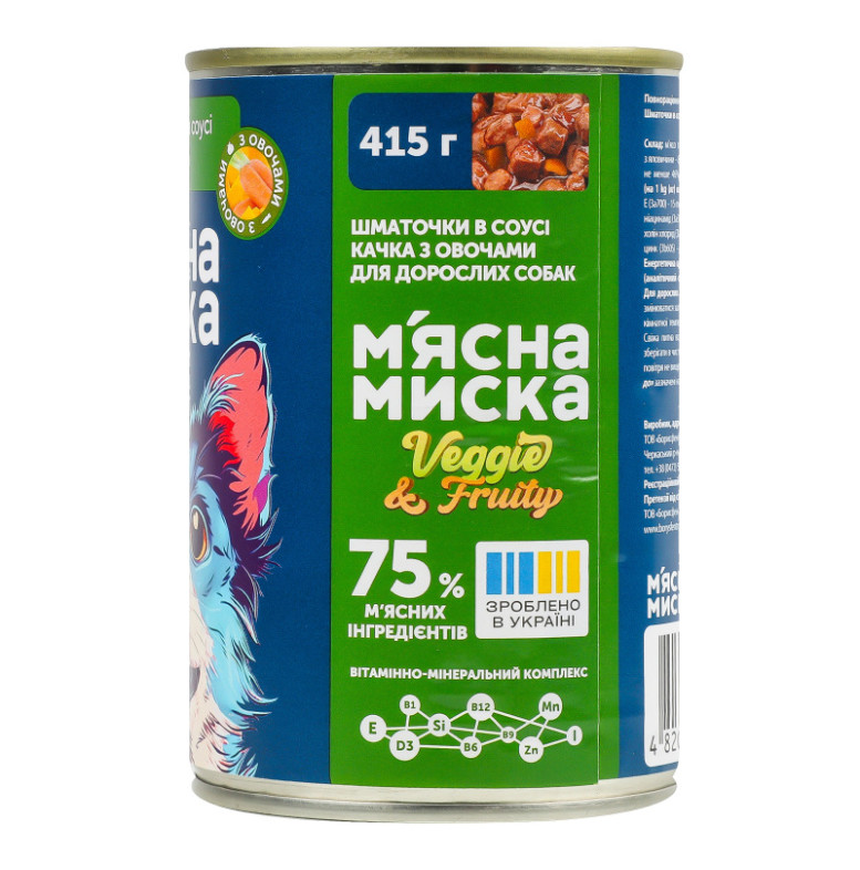 Корм консервований повнораціонний для дорослих собак Шматочки в соусі з качкою та овочами М'ясна Миска з/б 415г