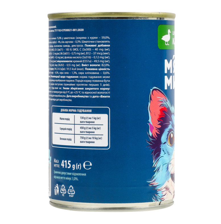 | Склад (укр.) | М'ясо та продукти тваринного походження не менше 75% у шматочках (зокрема з курки - 59%, з яловичини - 8%, з качки - 8%), злаки, овочі (морква, гарбуз) - 4%, сіль харчова - 0.3%, гуарова камедь, ксантанова камедь, декстроза |