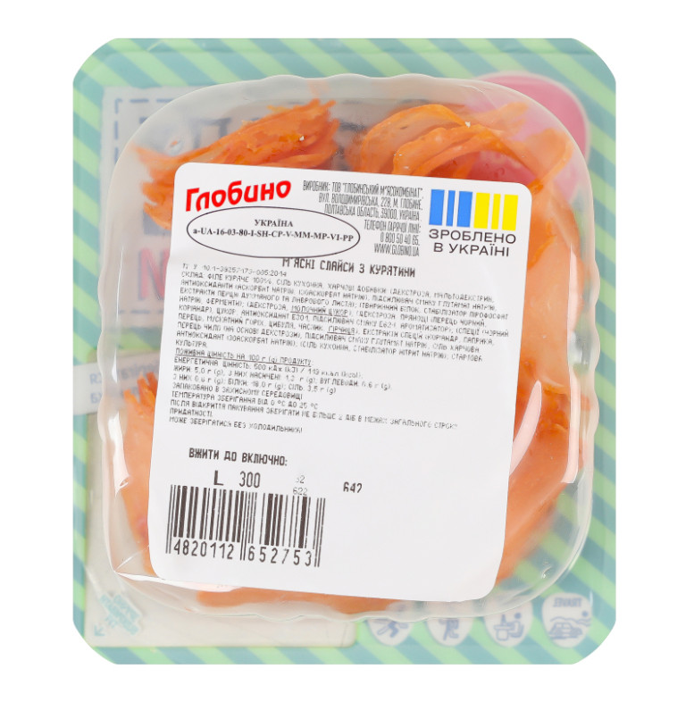 | Склад (укр.) | Філе куряче 100%, сіль кухонна, харчові добавки: (декстроза, мальтодекстрин, антиоксиданти (аскорбат натрію, ізоаскорбат натрію), підсилювач смаку глутамат натрію, екстракти перцю духмяного та лаврового листа), (тваринний білок, стабілізатор пірофосфат натрію, ферменти), (декстроза, молочний цукор), (декстроза, прянощі (перець чорний, коріандр), цукор, антиоксидант Е301, підсилювач смаку Е621, ароматизатор), (спеції (чорний перець, мускатний горіх, цибуля, часник, гірчиця), екстракти спецій (коріандр, паприка, перець чилі (на основі декстрози), підсилювач смаку глутамат натрію, сіль харчова, антиоксидант ізоаскорбат натрію), (сіль кухонна, стабілізатор нітрит натрію), стартова культура |