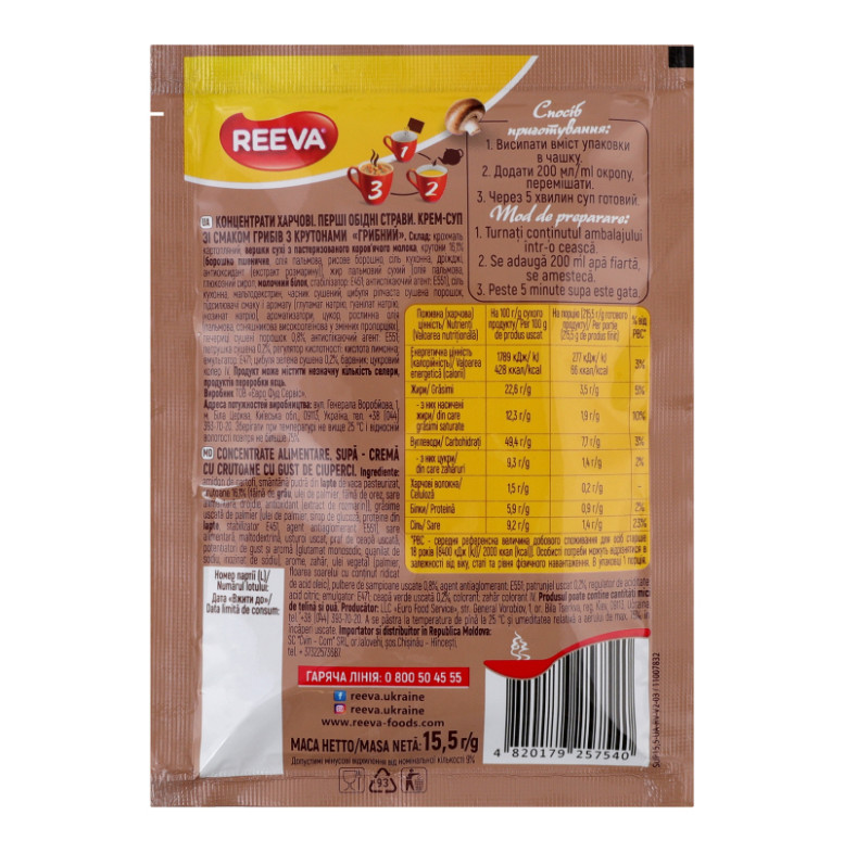 Крем-суп швидкого приготування зі смаком грибів з крутонами Грибний Reeva м/у 15.5г