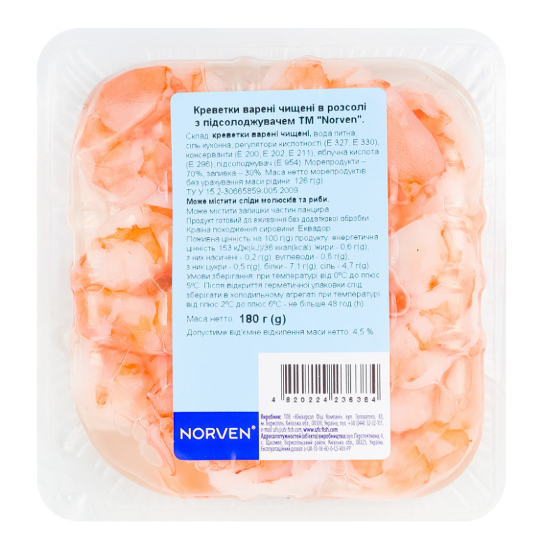 Склад (укр.) | Креветки варені чищені, вода питна, сіль кухонна, регулятори кислотності (Е372, Е330), консерванти (Е200, Е202, Е211), яблучна кислота (Е296), підсолоджувач (Е954) |