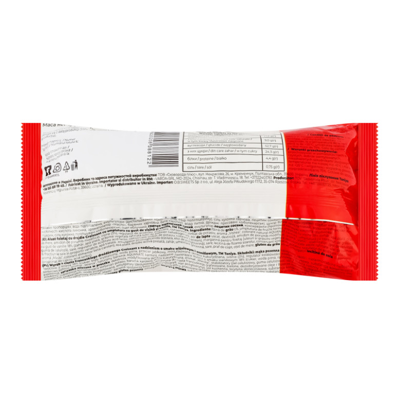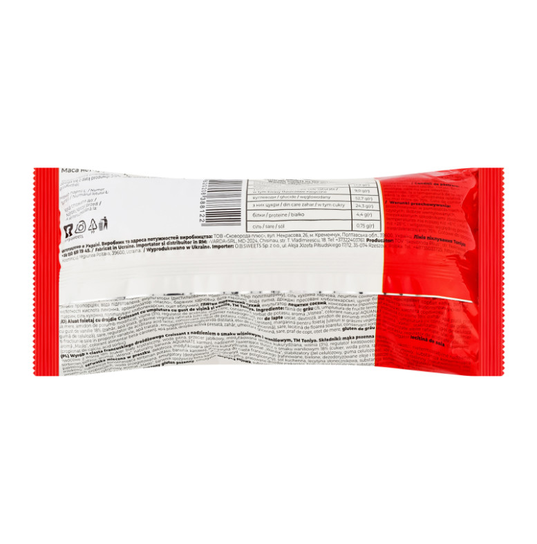 | Склад (укр.) | Борошно пшеничне в/г, наповнювач ягідний нетермостабільний з вишнею 18% (цукор білий кристалічний, вода питна, пюре яблучне, крохмаль кукурудзяний модифікований, вишня (3%), регулятор кислотності лимонна кислота, консервант сорбат калію, ароматизатор "Вишня", барвник натуральний Акванат кармін), наповнювач жировмісний зі смаком ванілі 18% (цукор, вода питна, рафінований рослинний жир (негідрогензована пальмова олія), сироватка молочна суха, декстроза, крохмаль кукурудзяний модифікований, ароматизатор "Ваніль", стабілізатори (целюлозний гель, целюлозна камедь), сіль кухонна регулятор кислотності молочна кислота, консервант сорбат калію, барвник каротин), маргарин листкового тіста (олії та жири рослинні рафіновані вибілені дезодоровані: олія пальмова та її фракції в змінних пропорціях, вода підготовлена, емульгатори (дистильований моногліцерид, ефір полігліцерину), сіль кухонна харчова, лецитин соняшниковий, консервант сорбат калію, регулятор кислотності кислота лимонна, ароматизатор "Масло", барвник харчовий бета-каротин), вода питна, дріжджі пресовані хлібопекарські, цукор білий кристалічний, вологоутримуючий агент гліцерин, сіль кухонна, поліпшувачі хлібопекарські, оцет яблучний, глютен пшеничний сухий, емульгатор лецитин соєвий, консерванти (пропіонат кальцію, кислота сорбінова) |