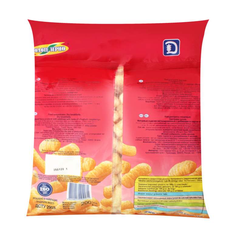 Склад (укр.): Крупа кукурудзяна або борошно, цукор білий, олія соняшникова рафінована дезодорована, сироватка молочна суха, ароматизатор "Малина", ароматизатор "Йогурт"