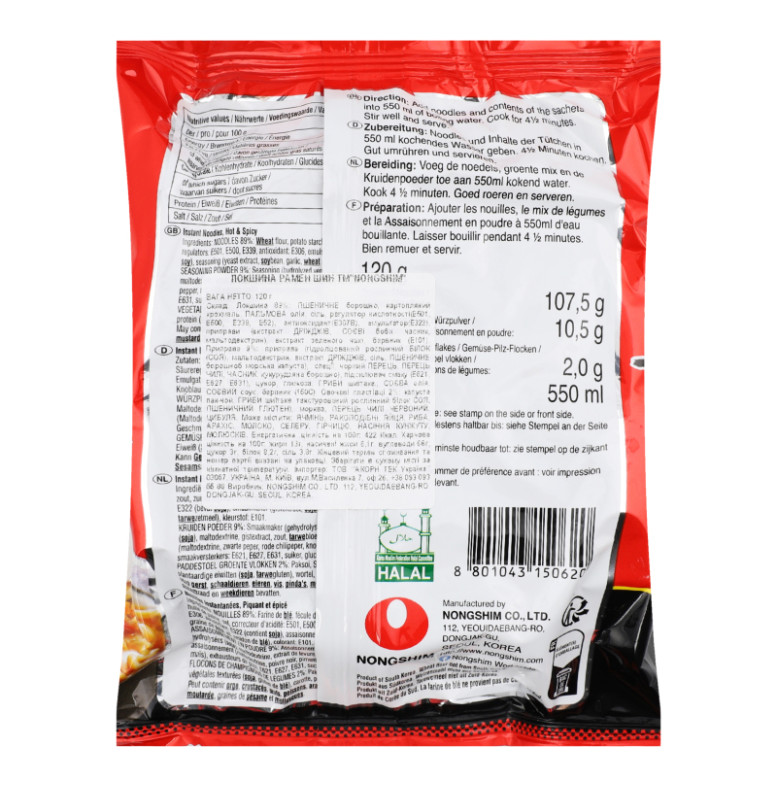 Склад: Локшина 28%: пшеничне борошно, картопляний крохмаль, пальмова олія, сіль, регулятор кислотності (E501, E500, E339, E52), антиоксидант (E307B), емульгатор (E322), приправи (екстракт дріжджів, соєві боби, часник, мальтодекстрин), екстракт зеленого чаю, барвник (E101). Приправа 9%: приправа (гідролізований рослинний білок (соя), мальтодекстрин, екстракт дріжджів, сіль, пшеничне борошно, морська капуста), спеції, чорний перець, перець чилі, часник, кукурудзяне борошно), підсилювач смаку (E621, E627, E631), цукор, глюкоза, гриби шиїтаке, соєва олія, соєвий соус, барвник (150C). Овочеві пластівці 2%: капуста пак-чой, гриби шиїтаке, текстурований рослинний білок, соя, пшеничний глютен), морква, перець чилі червоний, цибуля