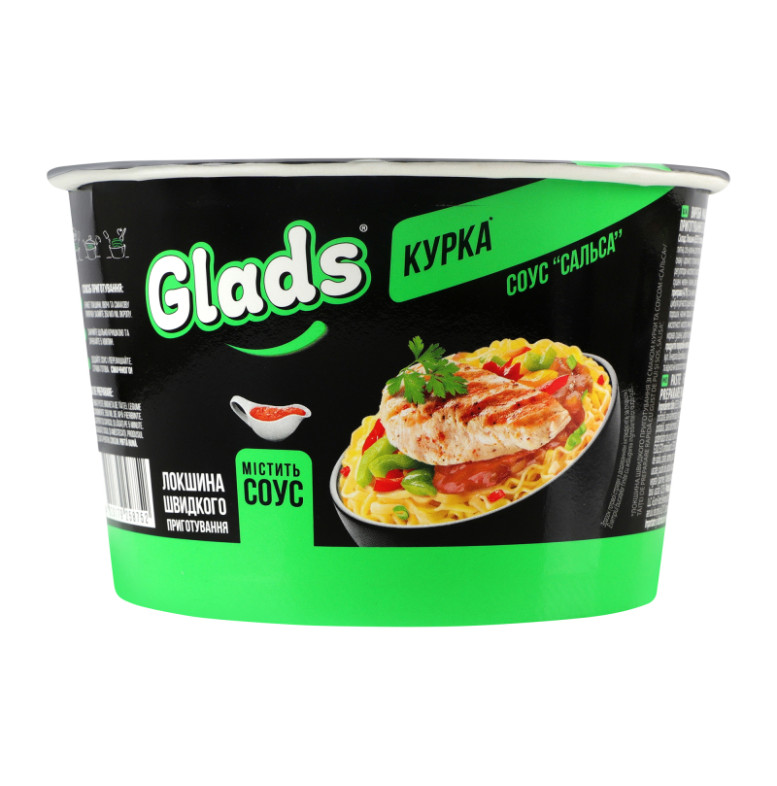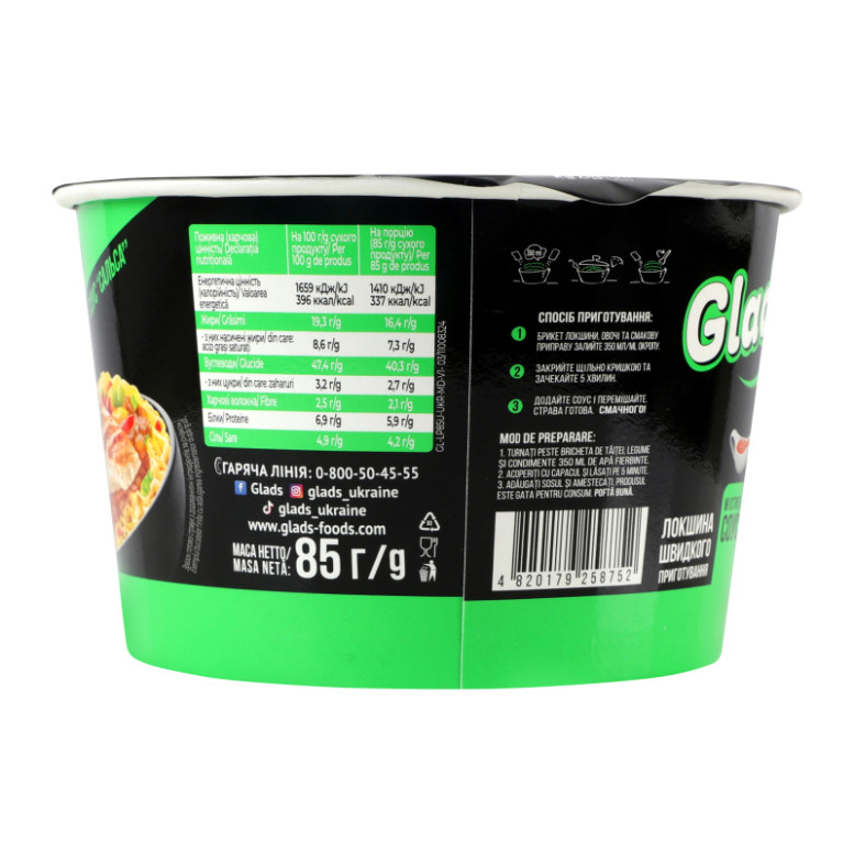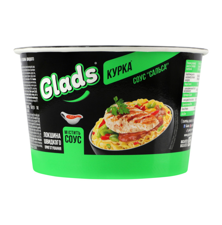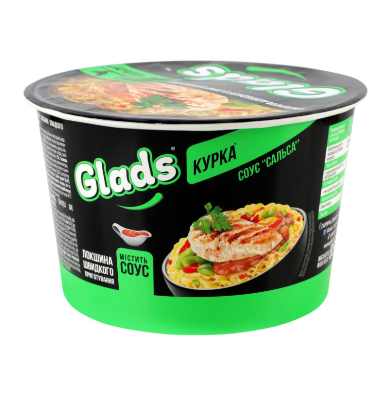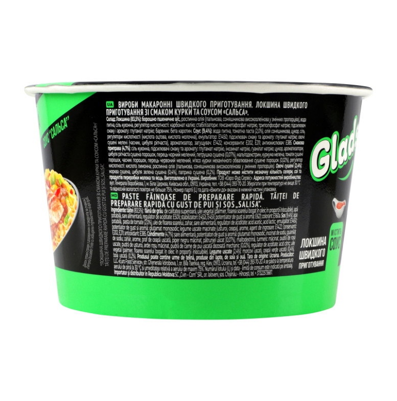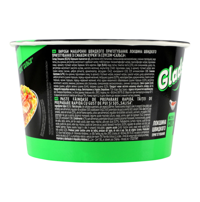Склад: Локшина (83.5%): борошно пшеничне в/с, рослинна олія (пальмова, соняшникова високоолеїнова у змінних пропорціях), вода питна, сіль кухонна, регулятор кислотності: карбонат калію, стабілізатори: гексаметафосфат натрію, триполіфосфат натрію, підсилювач смаку і аромату: глутамат натрію, барвник: бета каротин. Соус (9.4%): вода питна, томатна паста (2%), олія соняшникова, цукор, сіль, регулятори кислотності (кислота оцтова, кислота молочна), емульгатор: Е1450, підсилювач смаку та аромату: глутамат натрію, овочі сушені мелені (часник, цибуля ріпчаста), ароматизатор, загущувач: Е1422, консерванти: Е202, E211, антиокислювач: Е385. Смакова приправа (4.7%): сіль кухонна, підсилювачі смаку та аромату: глутамат натрію, інозинат натрію, гуанілат натрію, цукор, ароматизатори, цибуля ріпчаста сушена порошок, перець чорний мелений, петрушка сушена (0.07%), мальтодекстрин, куркума мелена, томати сушені порошок, часник порошок, перець червоний мелений, м'ясо курки механічного обвалювання сушене порошок (0.02%), регулятор кислотності: кислота лимонна, рослинна олія (пальмова, соняшникова високоолеїнова у змінних пропорціях). Овочі сушені (2.4%): морква сушена, цибуля зелена сушена (0.4%), паприка сушена (0.2%)