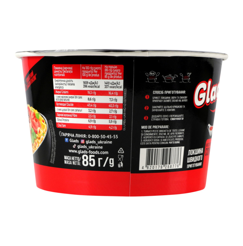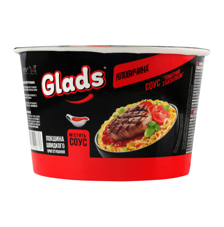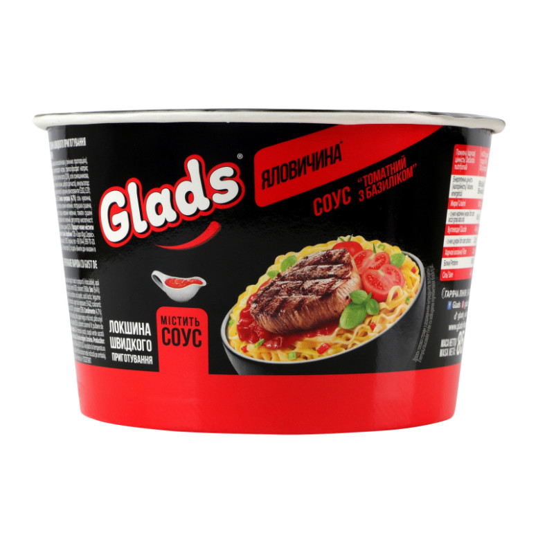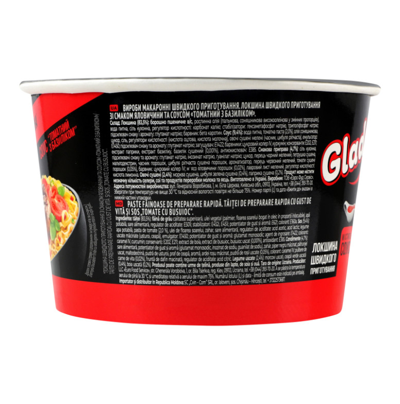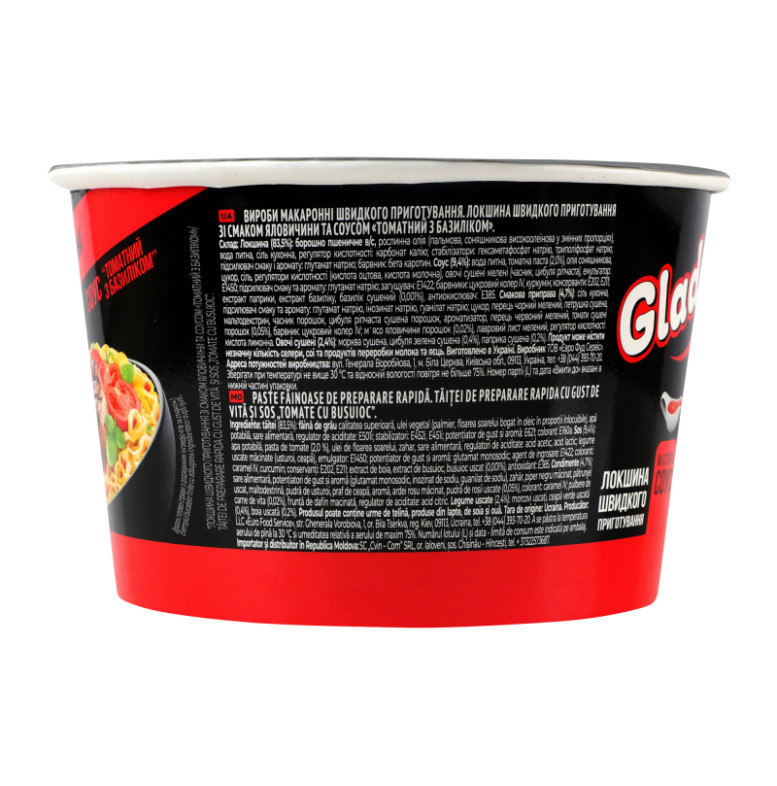 Склад: Локшина (83.5%): борошно пшеничне в/с, рослинна олія (пальмова, соняшникова високоолеїнова у змінних пропорціях), вода питна, сіль кухонна, регулятор кислотності: карбонат калію, стабілізатори: гексаметафосфат натрію, триполіфосфат натрію, підсилювач смаку і аромату: глутамат натрію, барвник: бета каротин. Соус (9.4%): вода питна, томатна паста (2%), олія соняшникова, цукор, сіль, регулятори кислотності (кислота оцтова, кислота молочна), овочі сушені мелені (часник, цибуля ріпчаста), емульгатор: Е1450, підсилювач смаку та аромату: глутамат натрію, загущувач: Е1422, барвники: цукровий колер IV, куркумін, консерванти: Е202, Е211, екстракт паприки, екстракт базиліку, базилік сушений (0.001%), антиокислювач: Е385. Смакова приправа (4.7%): сіль кухонна, підсилювачі смаку та аромату: глутамат натрію, інозінат натрію, гуанілат натрію, цукор, перець чорний мелений, петрушка сушена, мальтодекстрин, часник порошок, цибуля ріпчаста сушена порошок, ароматизатор, перець червоний мелений, томати сушені порошок (0.05%), барвник: цукровий колер IV, м'ясо яловичини порошок (0.02%), лавровий лист мелений, регулятор кислотності: кислота лимонна. Овочі сушені (2.4%): морква сушена, цибуля зелена сушена (0.4%), паприка сушена (0.2%)
