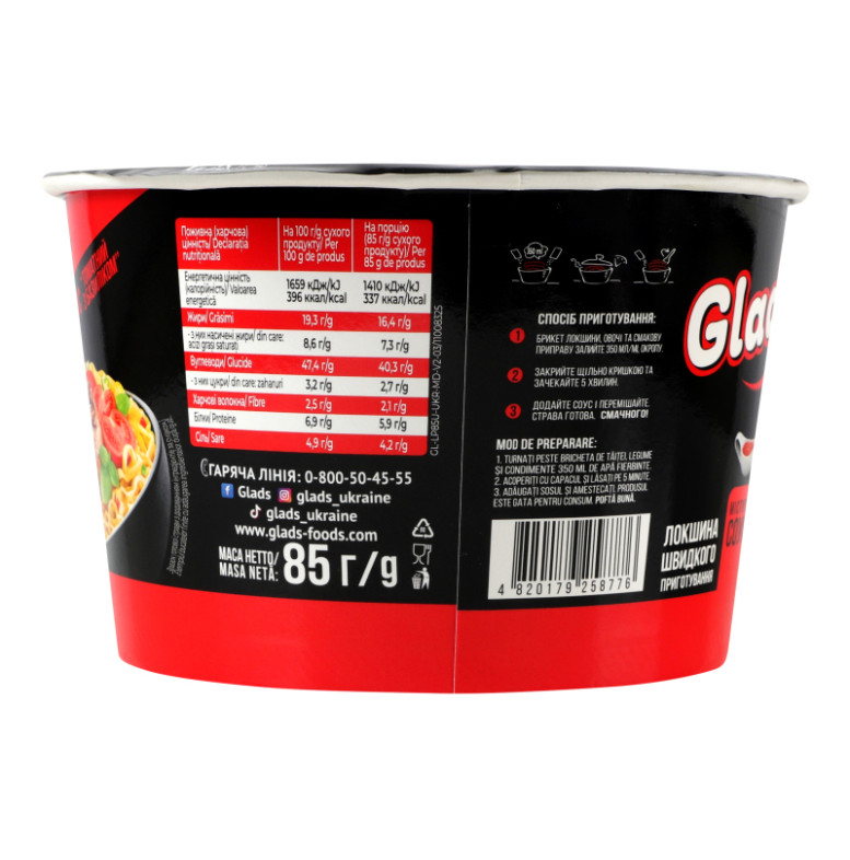 Склад: Локшина (83.5%): борошно пшеничне в/с, рослинна олія (пальмова, соняшникова високоолеїнова у змінних пропорціях), вода питна, сіль кухонна, регулятор кислотності: карбонат калію, стабілізатори: гексаметафосфат натрію, триполіфосфат натрію, підсилювач смаку і аромату: глутамат натрію, барвник: бета каротин. Соус (9.4%): вода питна, томатна паста (2%), олія соняшникова, цукор, сіль, регулятори кислотності (кислота оцтова, кислота молочна), емульгатор: Е1450, підсилювач смаку та аромату: глутамат натрію, овочі сушені мелені (часник, цибуля ріпчаста), ароматизатор, загущувач: Е1422, консерванти: Е202, E211, антиокислювач: Е385. Смакова приправа (4.7%): сіль кухонна, підсилювачі смаку та аромату: глутамат натрію, інозинат натрію, гуанілат натрію, цукор, ароматизатори, цибуля ріпчаста сушена порошок, перець чорний мелений, петрушка сушена (0.07%), мальтодекстрин, куркума мелена, томати сушені порошок, часник порошок, перець червоний мелений, м'ясо курки механічного обвалювання сушене порошок (0.02%), регулятор кислотності: кислота лимонна, рослинна олія (пальмова, соняшникова високоолеїнова у змінних пропорціях). Овочі сушені (2.4%): морква сушена, цибуля зелена сушена (0.4%), паприка сушена (0.2%)