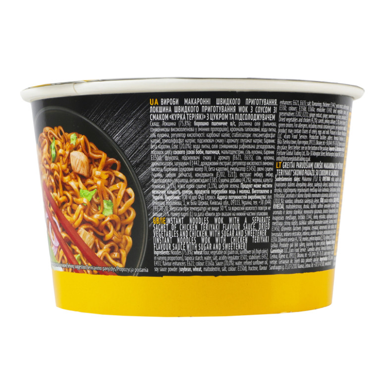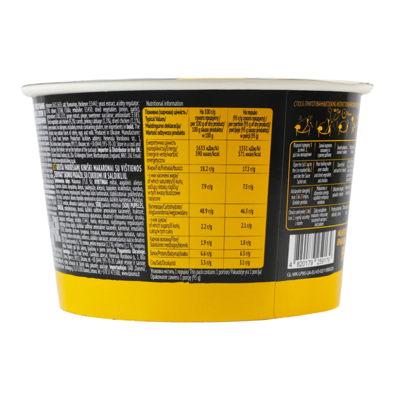 | Склад (укр.) | Локшина (75.8%): борошно пшеничне в/с, рослинна олія (пальмова, соняшникова високоолеїнова у змінних пропорціях), крохмаль тапіоковий, вода питна, сіль кухонна, регулятор кислотності: карбонат калію, стабілізатори: гексаметафосфат натрію, триполіфосфат натрію, підсилювач смаку і аромату: глутамат натрію, барвник: бета-каротин. Соус (20%): вода питна, олія соняшникова рафінована дезодорована, порошок соусу соєвого (соєві боби, пшениця, мальтодекстрин, сіль кухонна, барвник Е150d), фруктоза, підсилювачі cмаку і аромату (Е621, Е635), сіль кухонна, ароматизатори, загущувач E1442, дріжджовий екстракт, регулятор кислотності лимонна кислота, барвники (цукровий колер IV, бета-каротин), емульгатор Е1450, овочі сушені (часник, цибуля ріпчаста), консерванти (Е202, Е211), екстракт імбиру, імбир, підсолоджувач сукралоза, антиоксидант (Е385). Сушена добавка (4.2%): морква, капуста пекінська (1.3%), м'ясо курки сушене (1.1%), цибуля зелена |