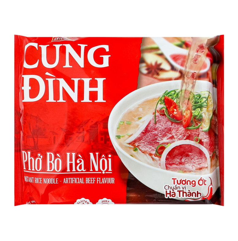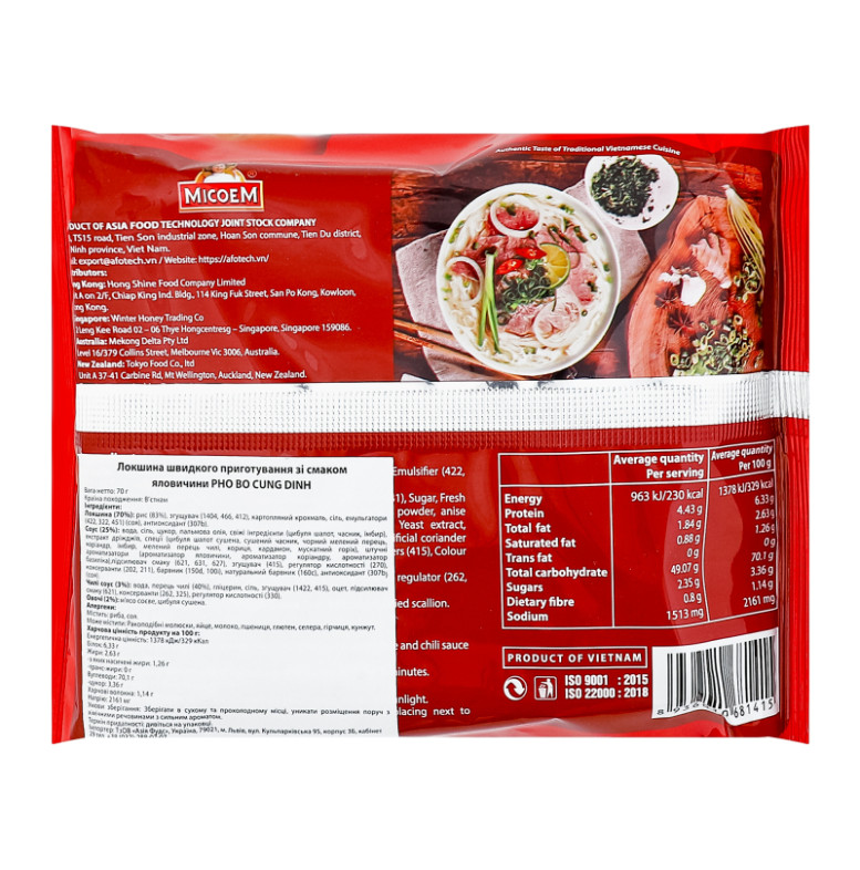 Склад: Локшина (70%): рис (83%), згущувач (E1404, E466, E412), картопляний крохмаль, сіль, емульгатори (E422, E322, E451) (соя), антиоксидант (E307b). Соус (25%): вода, сіль, цукор, пальмова олія, свіжі інгредієнти (цибуля шалот, часник, імбир), екстракт дріжджів, спеції (цибуля шалот сушена, сушений часник, чорний мелений перець, коріандр, імбир, мелений перець чилі, кориця, кардамон, мускатний горіх), штучні ароматизатори (ароматизатор яловичини, ароматизатор коріандру, ароматизатор базиліка), підсилювач смаку (E621, E631, E627), згущувач (E415), регулятор кислотності (E270), консерванти (E202, E211), барвник (E150d, E100i), натуральний барвник (E160c), антиоксидант (E307b) (соя). Чилі соус (3%): вода, перець чилі (40%), гліцерин, сіль, згущувач (E1422, E415), оцет, підсилювач смаку (E621), консерванти (E262, E325), регулятор кислотності (E330). Овочі (2%): м'ясо соєве, цибуля сушена