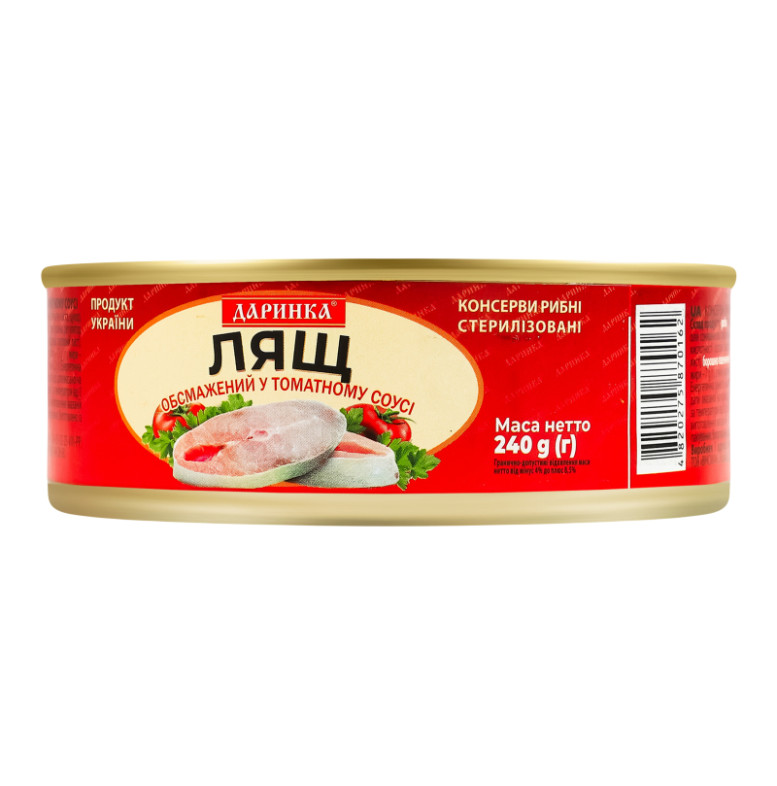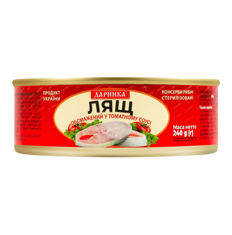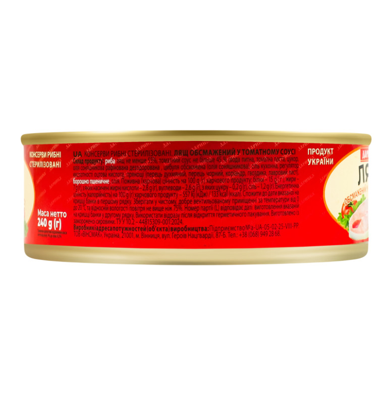 Склад: Риба лящ не менше 55%, томатний соус не більше 45% (вода питна, томатна паста, цукор, олія соняшникова рафінована дезодорована, цибуля обсмажена (олія соняшникова), сіль кухонна, регулятор кислотності оцтова кислота, прянощі (перець духмяний, перець чорний, коріандр, гвоздика, лавровий лист), борошно пшеничне, олія